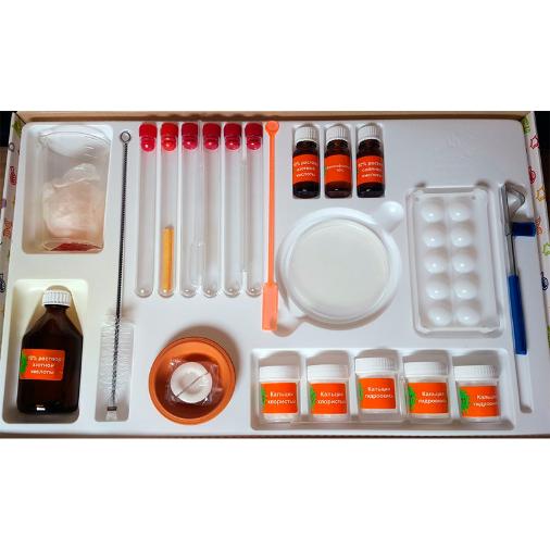 инструкция, перчатки, пипетка Пастера, подставка под пробирки (штатив), ершик для пробирок, пробирки химические, трубка стеклянная Г-образная, трубка стеклянная прямая, фильтровальная бумага, чашка для выпаривания, чашка Петри, стакан мерный, шпатель, сухое горючее, реактивы, бумага индикаторная лакмусовая нейтральная, компакт-диск с видео. |