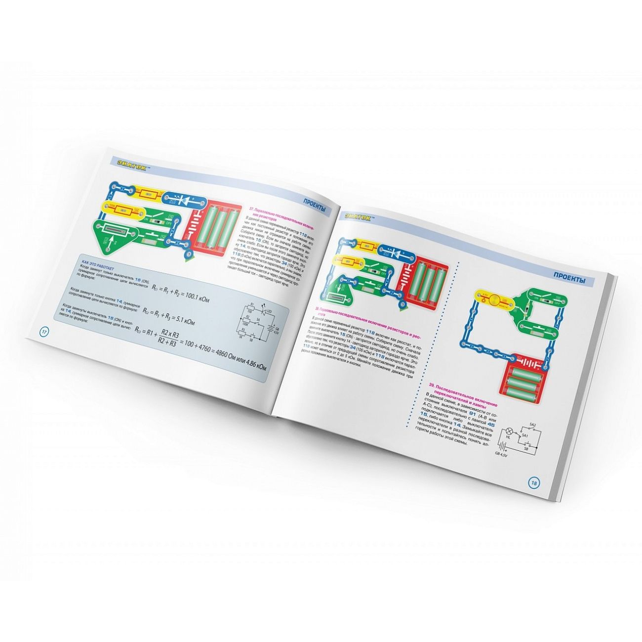 В комплекте «Руководство пользователя» Детали, необходимые для выполнения предложенных в руководстве проектов Руководство с описанием схем располагается в коробке под прозрачной монтажной платой. Нижняя часть коробки вместе с деталями и книгой запечатана в полиэтиленовую пленку.