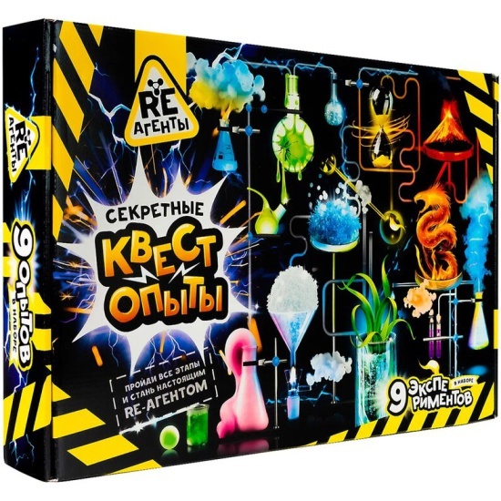 Секретная лаборатория хранит в себе множество тайн и загадок. Перед Вами 9 секретных опытов, которые необходимо провести в строго определенном порядке, чтобы лаборатория раскрыла свои секреты. Только истинный re-агент сможет провести все опыты. Сможете ли Вы пройти этот квест? Уникальный игровой процесс, позволяющий провести не только увлекательные эксперименты, но и игровой форме пройти настоящий квест. Этот набор предлагает познакомиться с химическии процессами и изучить свойства разных веществ. Все принадлежности, необходимые для успешной работы, включены в состав набора. В процессе игры дети смогут получить массу положительных эмоций, а также приобрести первые познания в науке и расширить кругозор. Хранить при температуре от +5 до +35 градусов С. Соответствует требованиям безопасности и стандартам качества продукции.