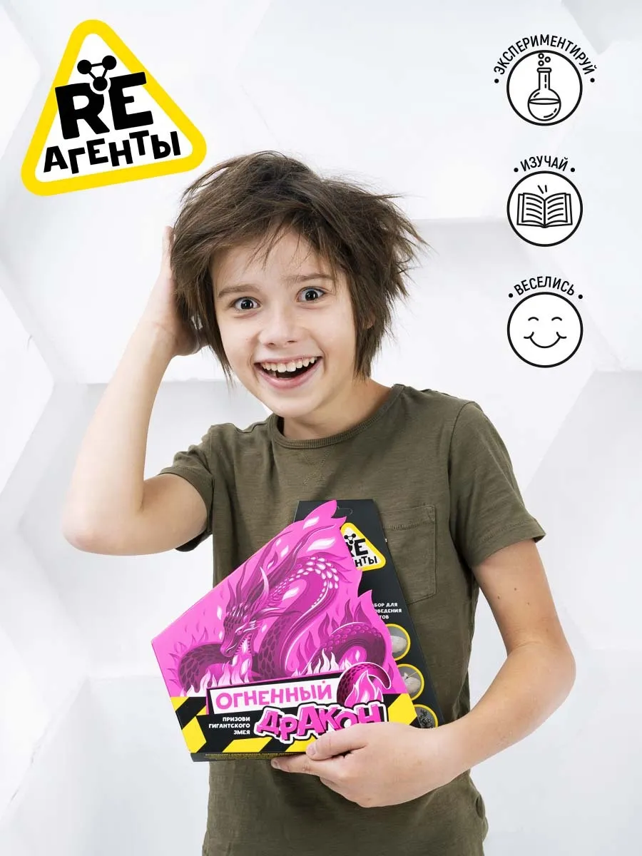 Научно-познавательный набор для опытов и эксперементов - Огненный дракон! Эффектный и яркий опыт, в котором ребенок может создать гигантскую углеродную змею! Химические опыты и эксперименты для детей - самый интересный подарок для мальчиков и девочек на любой праздник и просто без повода! Химия - это очень простая и увлекательная наука! С Ре-агенты вы получите настоящую химическую лабораторию у себя дома. Набор юного химика для детей - это набор для опытов и творчества, анистресс для развития мелкой моторики и кругозора, который не даст ребенку скучать! Что подарить ребенку на 6, 7, 8 лет? Опыты станут отличной альтернативой любимой настольной игре ребенка или сюрпризом на день рождения, выпускной в детском саду, подарком и интерактивным уроком для всего класса в начальной школе! Re-agenty (reagenty) оценят все, ведь это не просто опыты - это магия и фокусы! Играй, изучай, веселись!