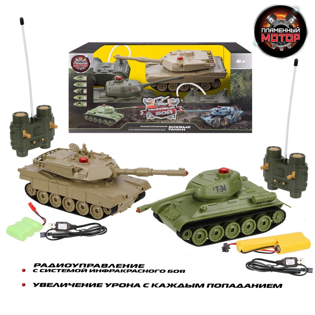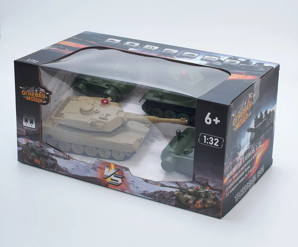 Радиоуправляемые модели танков Abrams M1A2 (США) и Т-34 (СССР) с реалистичными звуковыми и световыми эффектами при стрельбе и визуальными эффектами (отдача при выстреле) выполнены в масштабе 1:32. Танки осуществляют движение вперёд и назад, поворачивают вправо и влево, преодолевают подъёмы под углом 45°, совершают круговое вращение на месте и поворот башни вправо-влево на 320°.