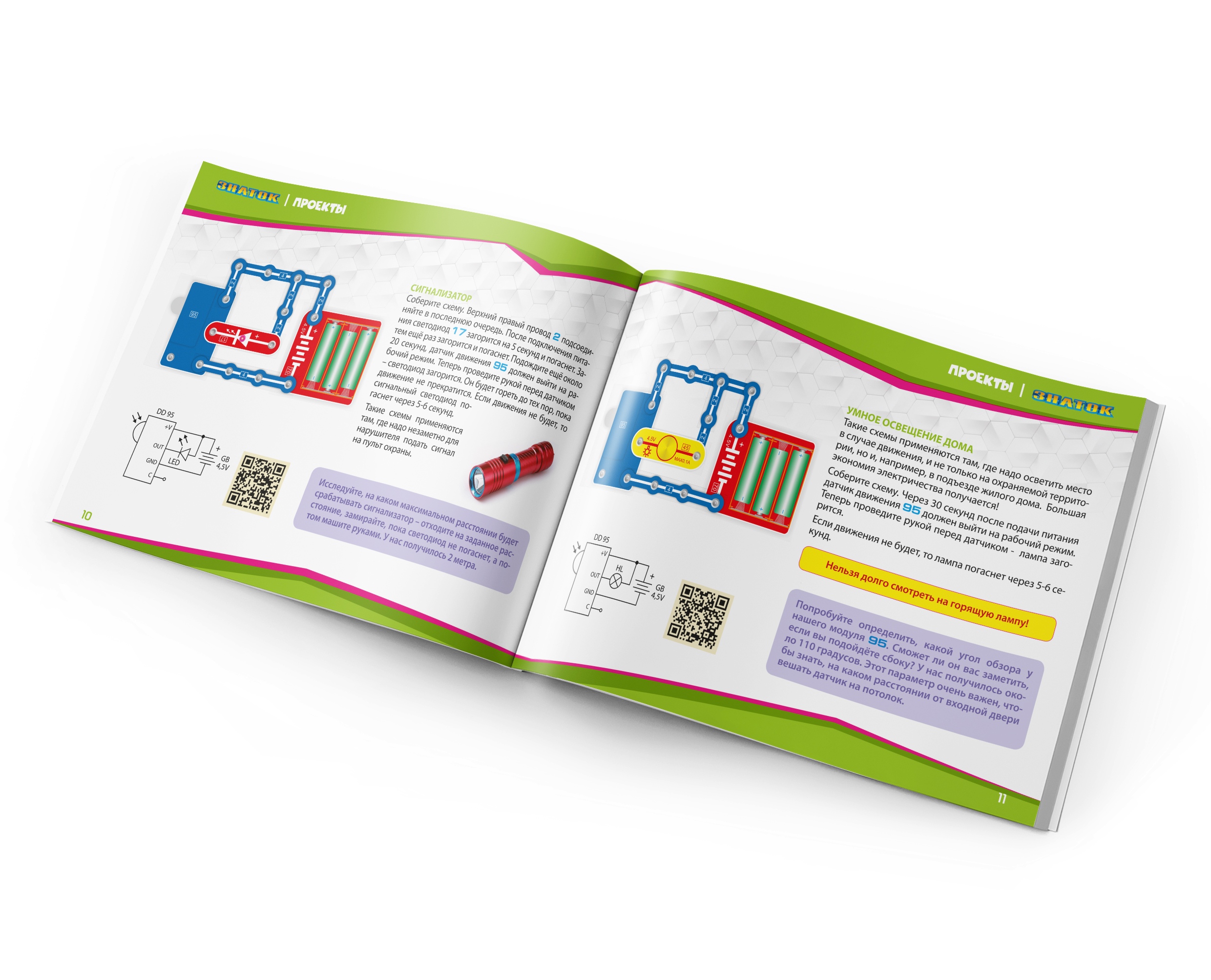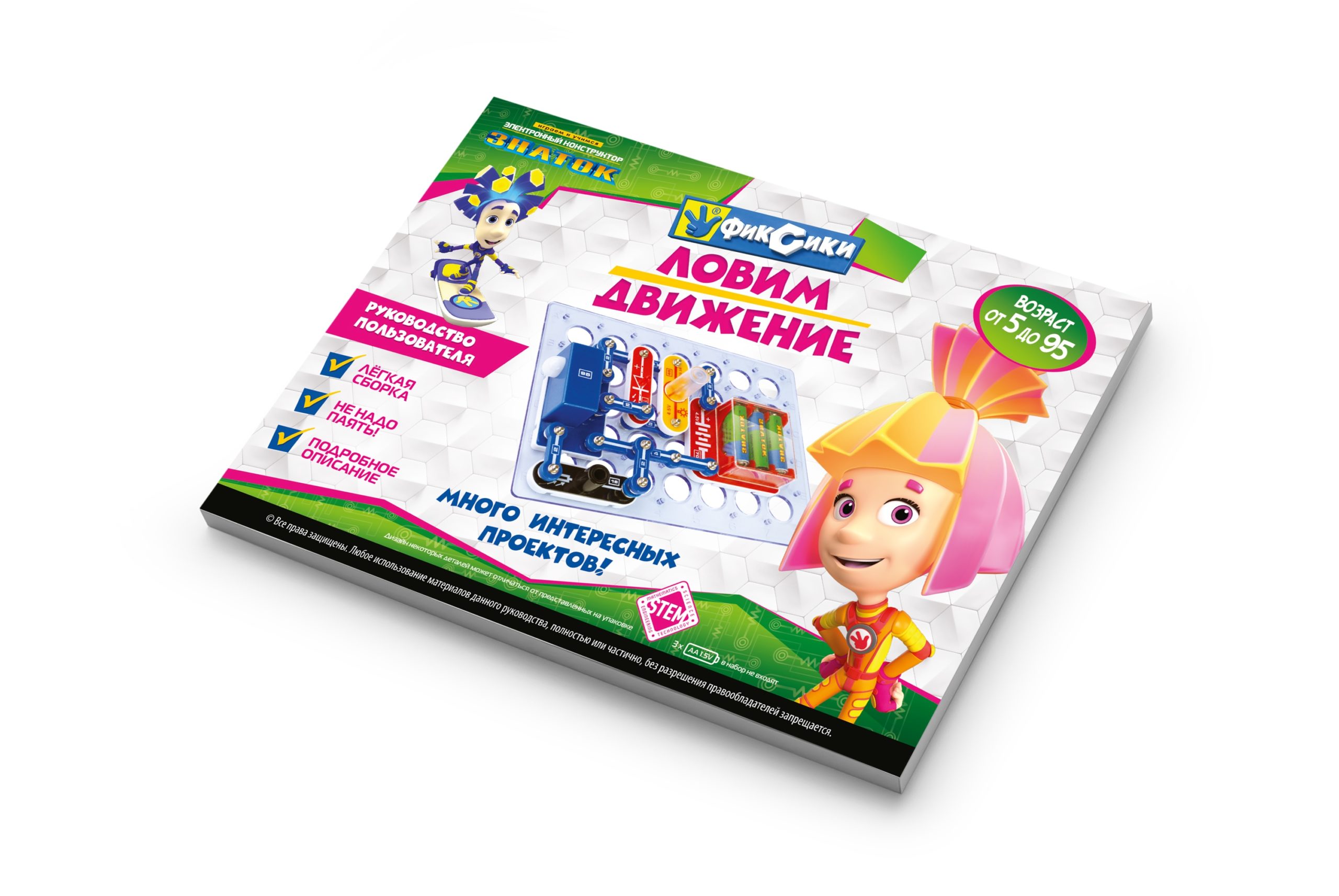 Электронный конструктор начального уровня, позволяющий ребёнку понять, как работают многие «умные вещи» вокруг нас, и в частности, исследовать схемы с датчиком движения, который используется в реальной жизни для охраны помещений или автоматического включения оборудования. Даже без помощи взрослых, используя очень понятное цветное руководство, всего за несколько минут, дети смогут собрать и испытать схему с практически 100% положительным результатом. Очень полезна будет подсказка в виде QR-кода, которую можно просмотреть при помощи смартфона или планшета.