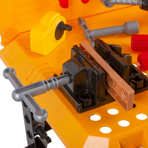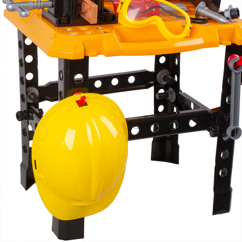 Детская мастерская выполнена в красно-сером цветовом сочетании с желтыми деталями. Детский верстак – это большой набор инструментов и аксессуаров, которые должны присутствовать в мастерской любого мастера по ремонту. В этой детской мастерской мальчики найдут строительную каску, очки, молоток, шуруповерт, пилу, гаечный ключ, шурупы, плоскогубцы, отвертку и другие аксессуары.