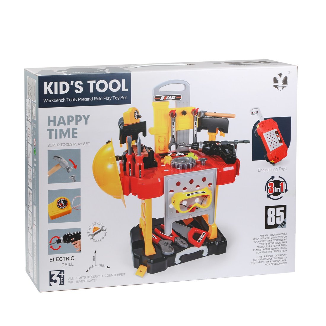 В комплекте 86 элементов: электродрель (работает от 2-х батареек типа АА, не входят в комплект) чемоданчик и детали для его трансформации в столик пила отвертки (2 шт) насадки (3 шт) молоток каска защитные очки гаечные ключи разводной ключ плоскогубцы струбцина сантиметр маска детали имитирующие древесину дюбеля крючки шестеренки гайки болты декоративные наклейки Детский набор инструментов изготовлен из безопасного и нетоксичного пластика.