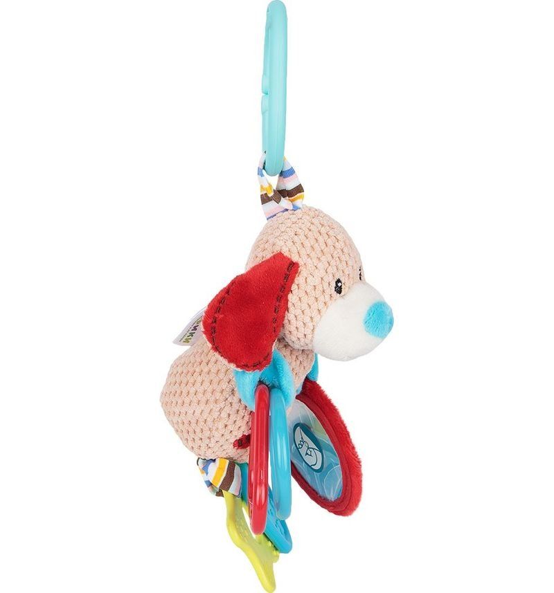 На другой лапке — безопасное зеркальце. Фактурные прорезыватели из мягкого пластика на задних лапках собачки помогут малышу справиться с неприятными ощущениями при прорезывании зубов. Крепление в виде колечка позволяет подвесить игрушку к бортику кроватки или к ручке автокресла.