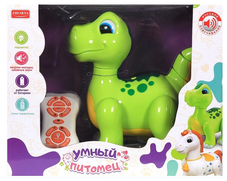 Это интерактивный динозаврик серии "Умный Я" на дистанционном управлении - оригинальный подарок с разнообразными функциями для развлечения вашего ребенка. Необычный, но очень милый, питомец умеет двигать головой и вилять хвостиком, ходить вперед и назад, бегать и танцевать. Кроме того, он с удовольствием общается и выполняет голосовые команды, поет, читает сказки и любит задавать интересные несложные вопросы, способствующие расширению кругозора ребенка. Пульт ДУ имеет простой и понятный для ребенка интерфейс: кнопки выполнены в удобной для детских пальчиков форме, маркированы командами на русском языке. Комплект функционирует от обычных пальчиковых батареек и готов к эксплуатации в любой момент.