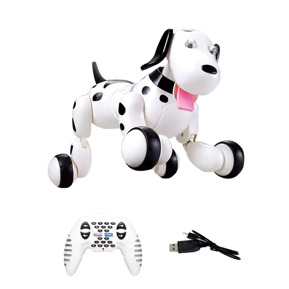 Радиоуправляемая игрушка робот-собака Smart Dog изготовлена из прочного глянцевого пластика. Она активно двигается, подражая живому щенку. За перемещение по ровным поверхностям отвечают встроенные в лапы колеса. Игрушка послушно выполняет команды, поступающие с пульта дистанционного управления: резво бегает, весело лает, переворачивается, ложится и встает, разворачивается вокруг себя, а также делает выпады вперед. Управление роботом осуществляется на частоте 2.4 G. Модель Happycow Smart Dog работает на литиевом аккумуляторе. Для зарядки используется USB-кабель. Для пульта управления необходимо купить батарейки формата АА.