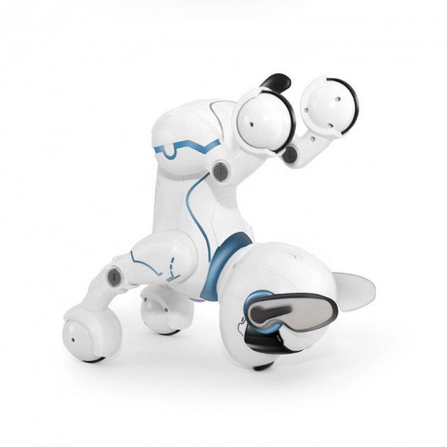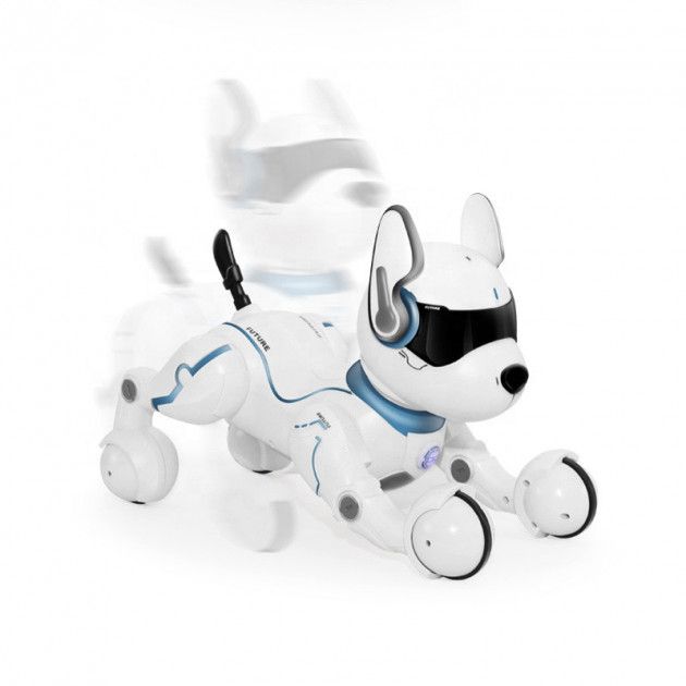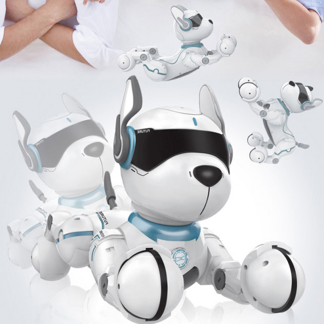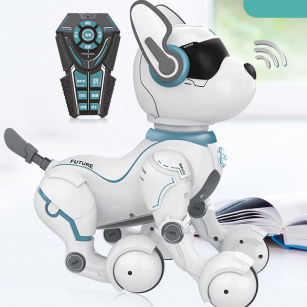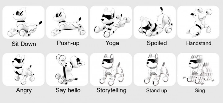 Описание функций радиоуправляемой собаки: Выполняет 12 голосовых команд, например, сидеть, стоять, злой пес, быть милым, петь, танцевать, отжиматься, йога и другие. Воспроизводит звуки, и имитирует повадки 10 разных животных. Можно самому программировать движения щенка, например, с командой «охрана», он будет защищать Вас на прогулке, выполняя программу «дразнить щенка» собака робот будет игриво двигаться вокруг хозяина и лаять.