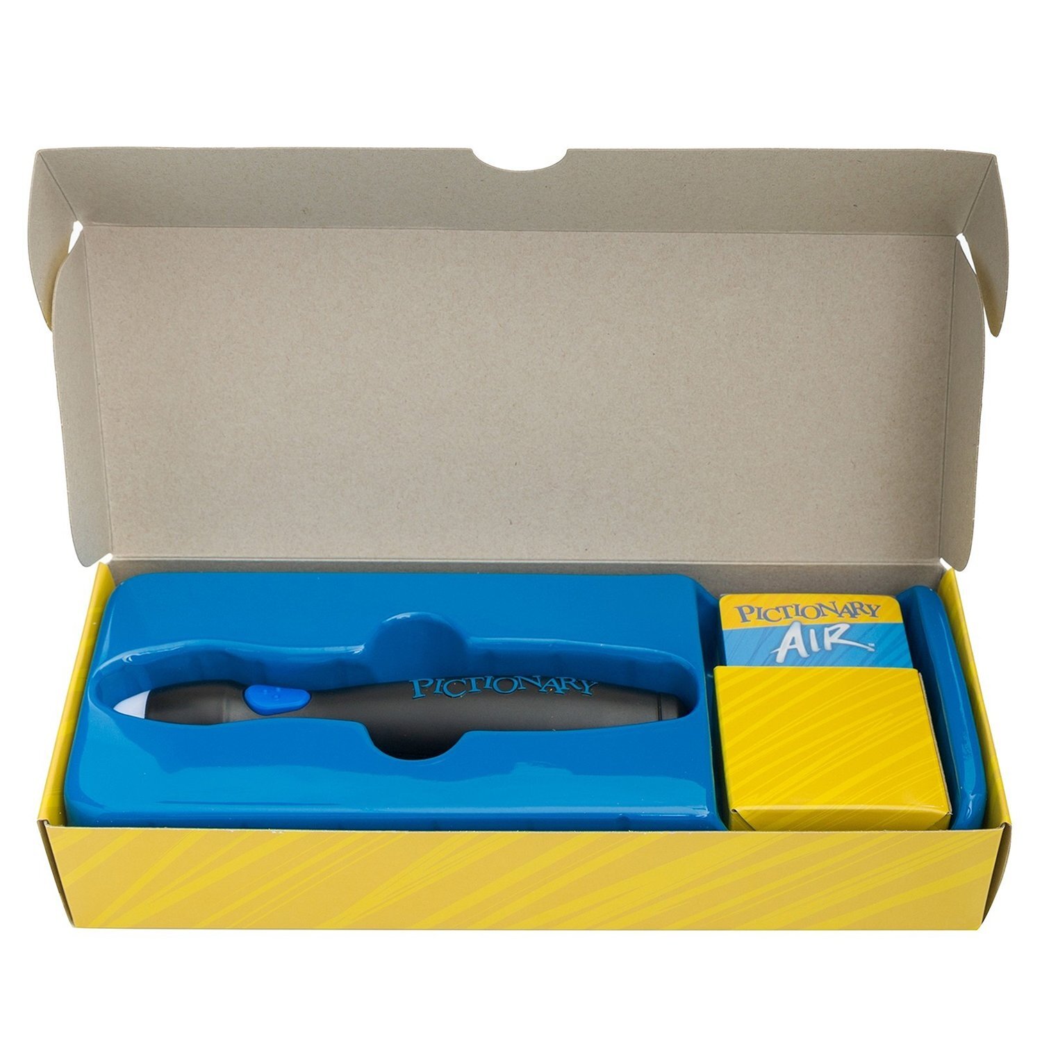 В комплекте: 1 ручка Pictionary Air, 112 двусторонних карточек подсказок, коробка для карточек и инструкции.