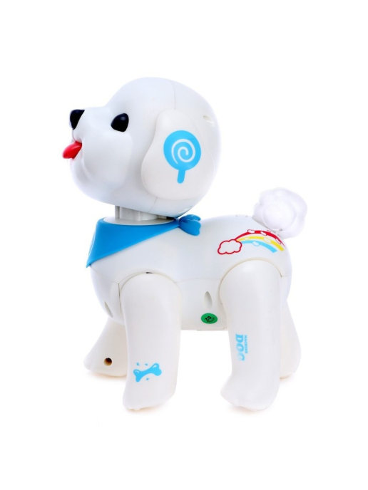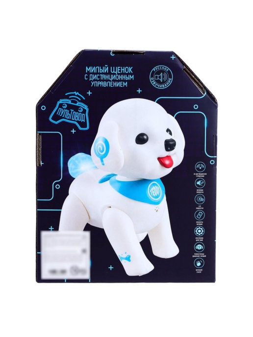 Милый щенок с дистанционным управлением из серии "Пультовод". С детскими песенками (3 песенки), веселыми фразами и звуковыми эффектами. Щенок может реалистично двигаться и поворачивать голову. Идет прямо и во время воспроизведений песен и поворачивает. С пульта управления можно активировать звуковой сенсор и программу действий. Щенок работает от от 3 батареек АА(не входят в комплект). Дистанционный пульт управления работает от батарейки 3V cr2025(в комплекте). Упаковка: коробка с окном.