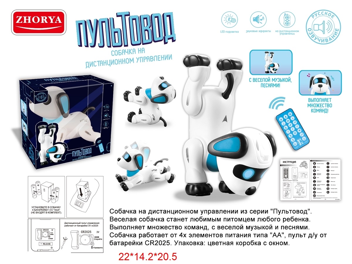 Радиоуправляемая собачка "Мини Акробат" - ZYA-A2906 - это собачка на дистанционном управлении из серии "Пультовод" с функцией выполнения трюков. Она знает команды: встать на передние лапы, сидеть, стоять, лежать, отжиматься, двигаться вперед. Под динамическую музыку (5 музыкальных композиций) собачка танцует.