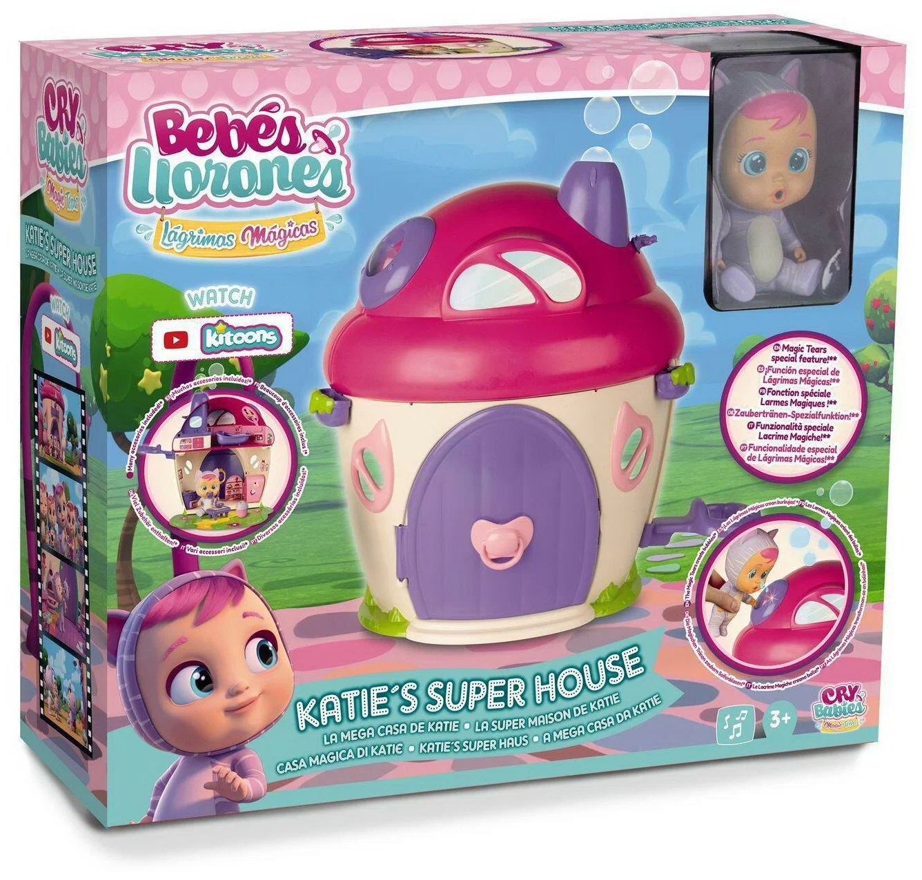 Игровой набор IMC Toys 97940 CRYBABIES Плачущий младенец Кэти в комплекте с домиком и аксессуарами. Малышка Кэти живет в красивом двухэтажном домике, где у нее есть не только кухня для приготовления угощений, но и ванная, в которой героиня игры расслабляется и слушает музыку. Жилище Кэти удивит детей привлекательным внешним видом, а также мыльными пузырями, которые неожиданно появятся из трубы. Особенности: Миниатюрная малышка Кэти плачет необычными слезами, которые оживляют ее красивый домик, и из его трубы неожиданно появляются мыльные пузыри. В распоряжении героини игры есть двухэтажное жилище, на первом этаже которого расположена кухня с плитой и холодильником.