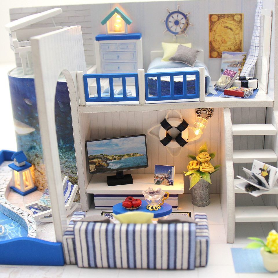 Интерьерный конструктор "Морской бриз" - конструктор-миниатюра домика на побережье с небольшим бассейном и белоснежным роялем! Бело-синий интерьер румбокса во время сборки позволяет полностью окунуться в атмосферу средиземноморского берега и напомнит о приятных солнечных днях волшебного отпуска и навеет фантазии о том, как можно беззаботно валяться на втором этаже своего дома на берегу моря на кровати в форме лодочки и наслаждаться морским бризом! Натуральные материалы для сборки - дерево, бумага, ткани. В комплект входит: все необходимые для создания миниатюры детали, светодиоды, инструменты для сборки, подробная инструкция на русском языке.