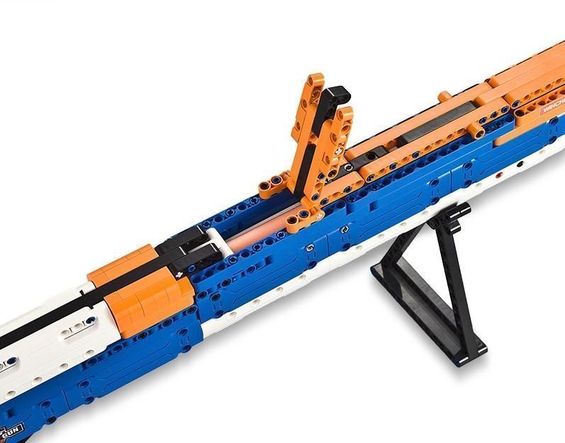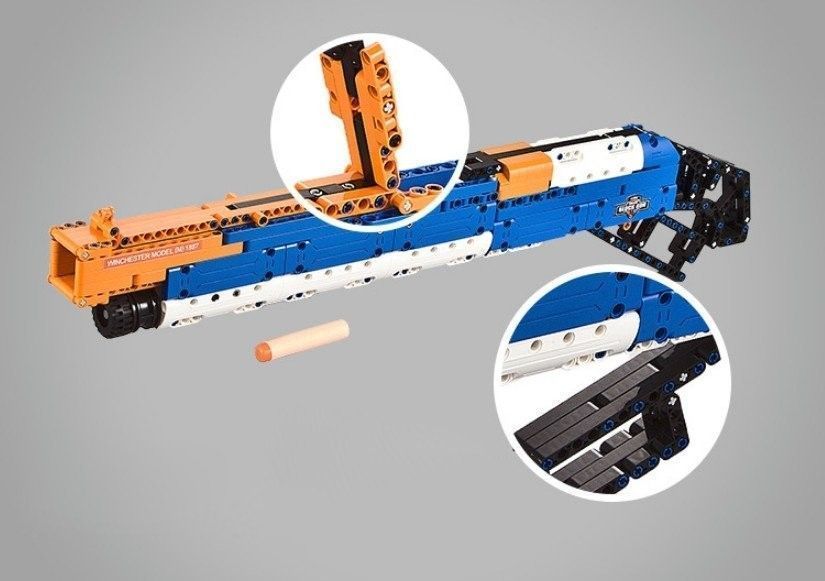 Полученный из деталей конструктора C81004 CaDA Винчестер. Модель 1887 макет достаточно функционален. В частности, у него можно открыть затвор, зарядить поролоновый патрон и закрыть. Ружьё готово к стрельбе – при нажатии спускового курка пуля вылетит из ствола. Для стрельбы лёжа, возможно прикрепить оружие на поддерживающую ствол ножку-треугольник. В комплекте конструктора всего пять патронов.