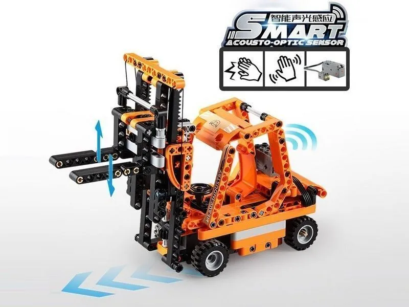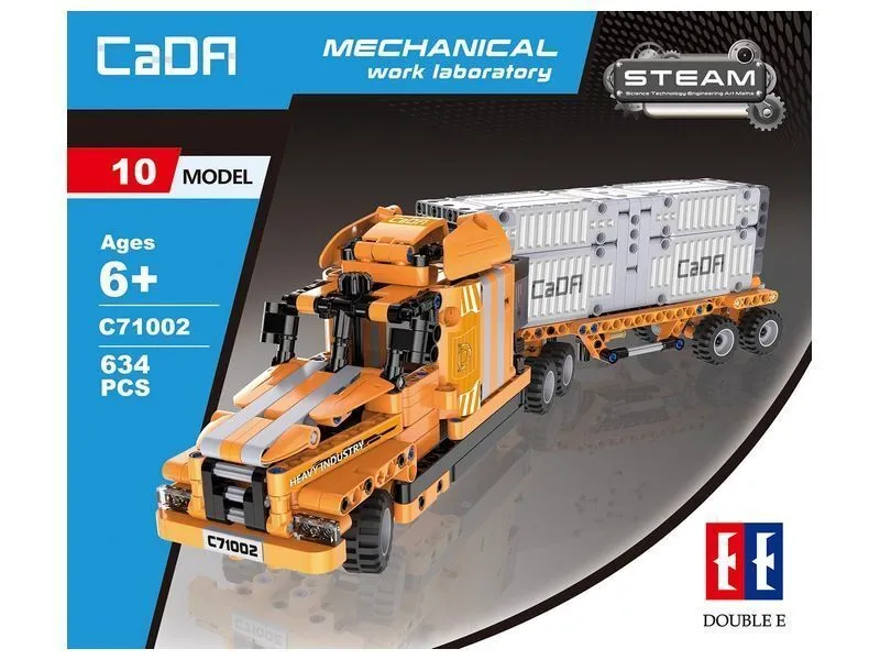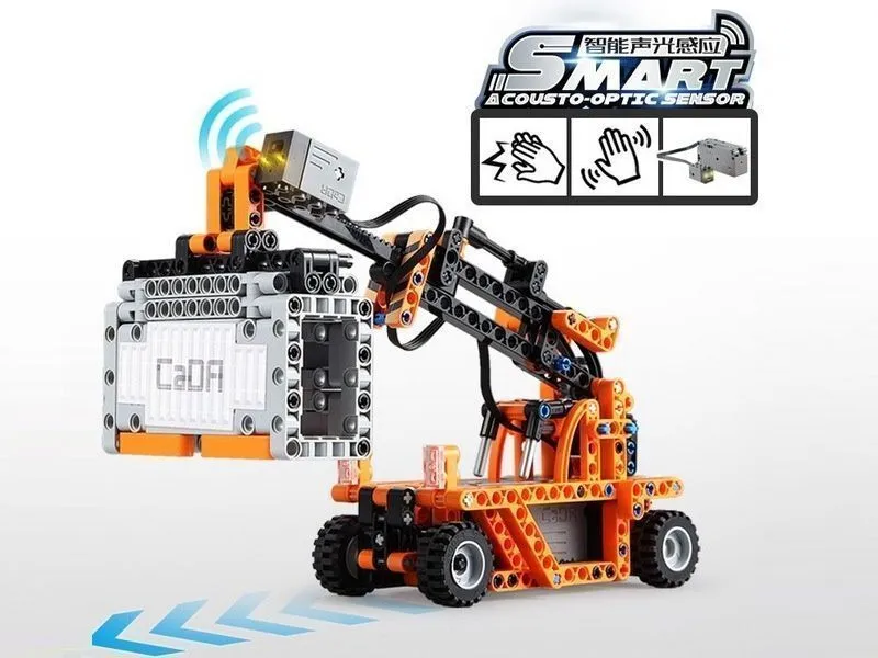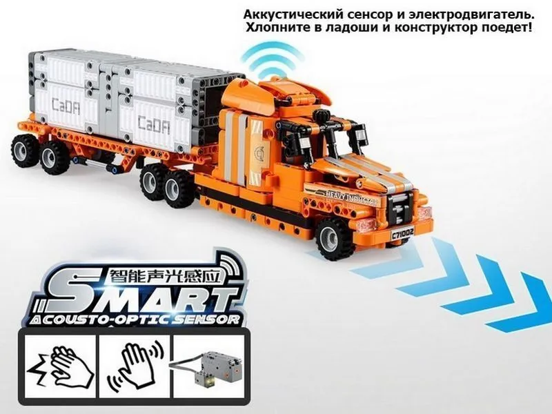 Основной моделью в конструкторе CaDa Technic С71002W является тягач с прицепом и конетейнером на нем. На кабине он имеет аккустический сенсор. Достаточно хлопнуть в ладоши и тягач поедет вперед. Повторный хлопок остановит машину. Еще одна такая же сенсорная модель - контейнеровоз со стрелой. При помощи сенсора управляется движение крана по поверхности, а подъем и длина вылета стрелы регулируется в ручную. Вилочный погрузчик работает по аналогичному принципу.