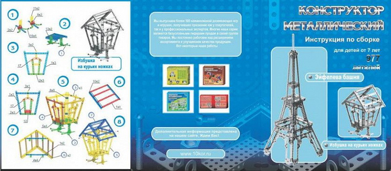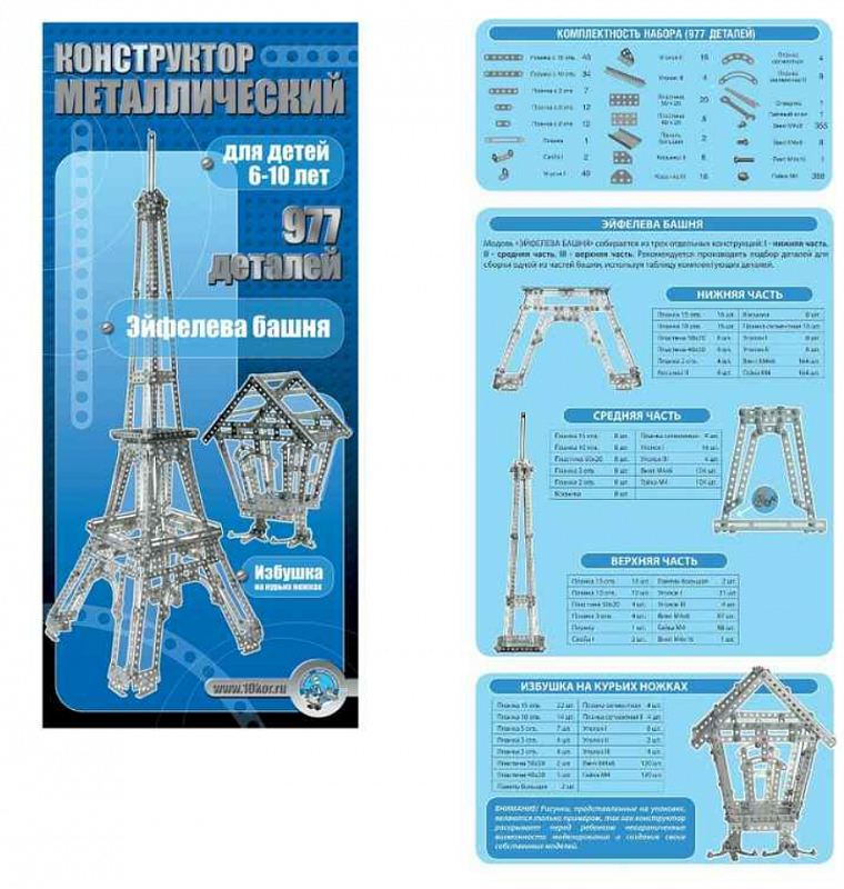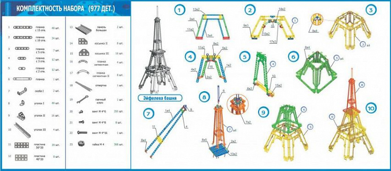 Этот железный конструктор является одним из наиболее больших и габаритных металлических конструкторов. И "детским" этот набор можно назвать достаточно условно, с некоторыми оговорками. Первоначально металлический конструктор "Эйфелева башня" состоял из 893-х деталей, затем имел в своем составе 909 деталей и, наконец, в сегодняшнем исполнении, имеет 977 деталей. В новом виде этот конструктор избавлен от длинных, неудобных и недостаточно прочных, по отзывам покупателей, деталей. Совершенно другой стала и схема сборки, сейчас она цветная и более подробная. Как и изначально, так и сейчас, конструктор позволяет собрать или "просто избушку" или макет Эйфелевой башни высотой 78 сантиметров. Советуем начинать с избушки, потому, что собирать и разбирать ее меньше по времени, а самое главное, разбирать не так жалко. Ведь спорным остается только 100% сходство нашей Эйфелевой башни с оригиналом, узнаваемость присутствует точно, и уже не одну детскую украшает наша металлическая конструкция как память о "трудовом подвиге".