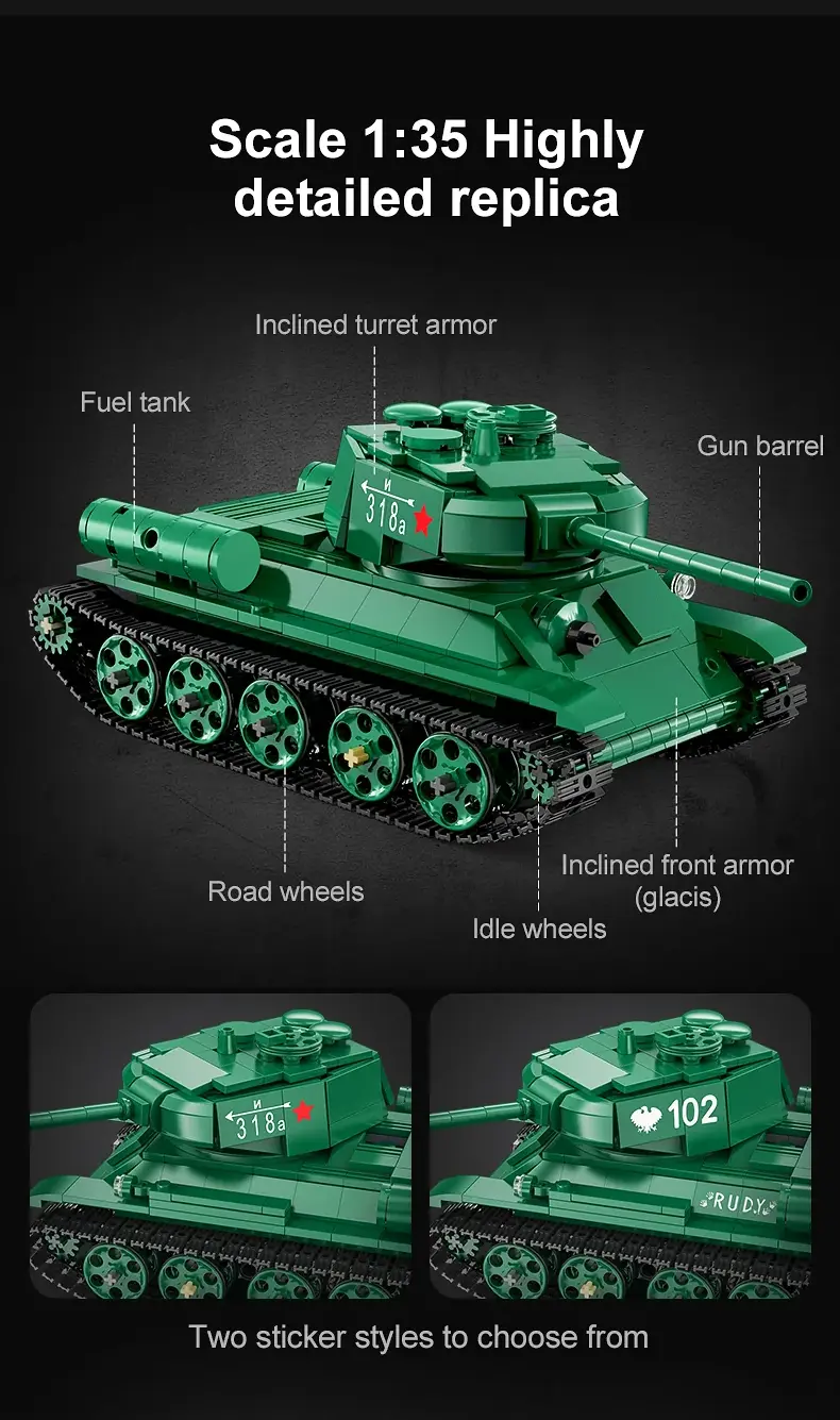 Танк Т34 на радиоуправлении конструктор Cada Technic C61072 Модель легендарного совецкого танка Второй мировой войны очень реалистичный. Зелёный цвет корпуса, топливные баки и выхлопные трубы в задней части кузова, бронированные шторки над гусеницами, люки механиков и командира, пулемет и прожекторы в носовой части боевой машины. Электромоторы обеспечивают движение гусениц и разворот танка на месте, а так же вращение башни на 360 градусов в обе стороны.