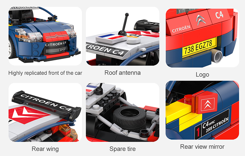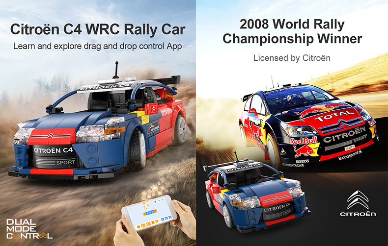 Радиоуправляемый конструктор от CADA представляет собой набор для постройки раллийного автомобиля Citroën C4WRC из 329 деталей в масштабе 1/20. Модель детально проработана - на корпусе присутствуют все надписи и обозначения реального прототипа, спойлер, запасное колесо и зеркала заднего вида. Управлять машинкой можно как при помощи пульта управления, так и приложения на телефоне.