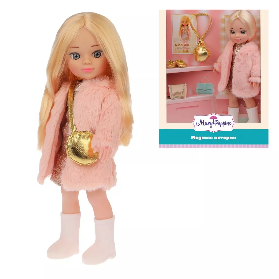 Кукла одета в роскошное платье, расшитое золотыми пайетками, белые высокие сапожки и стильную шубку из нежно-розового искусственного меха. В комплекте прилагаются модные золотистые туфельки и сумочка через плечо.