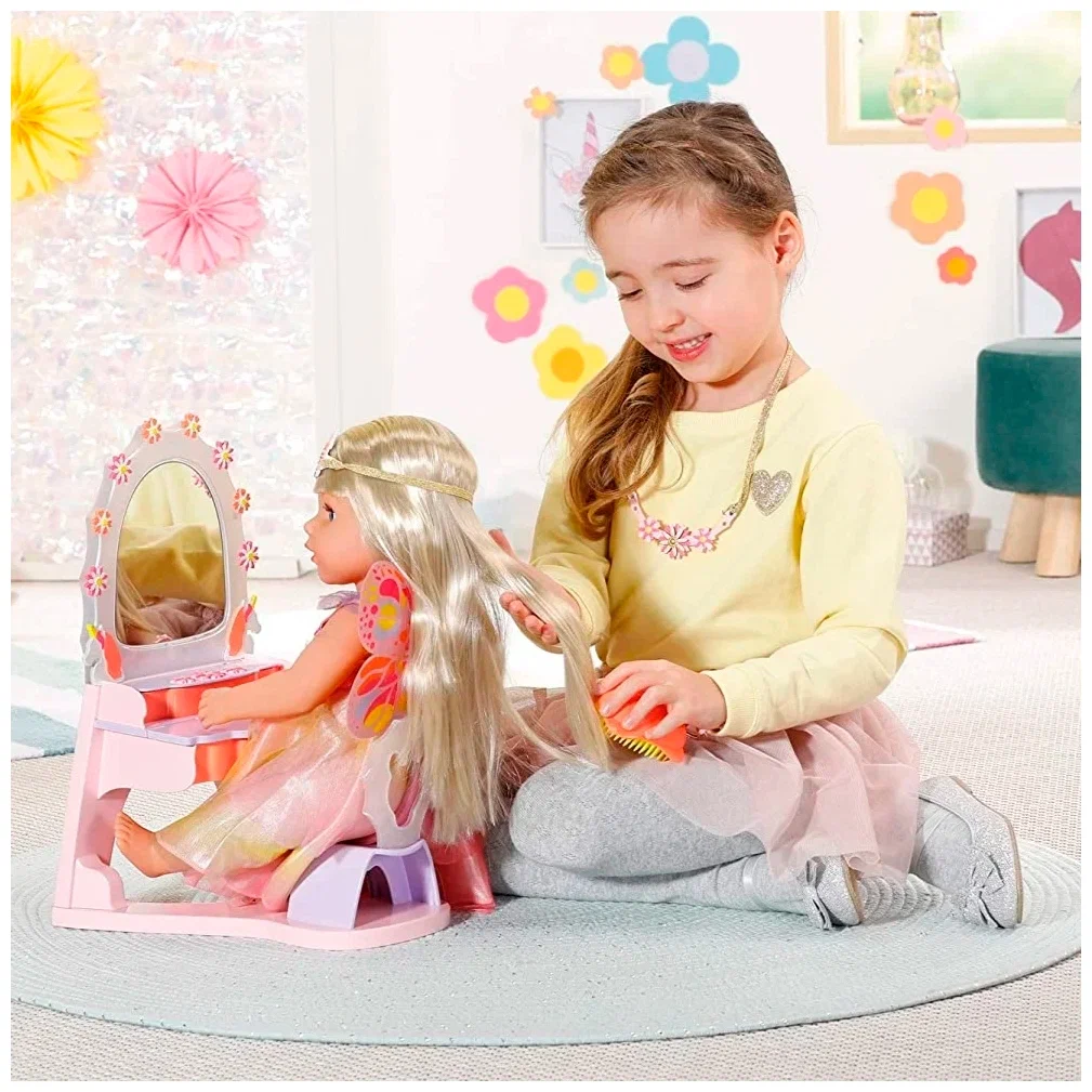 Интерактивная куколка Бэби Борн с красивыми глазками, пухлыми щечками и губками. Длинные светлые волосы с челкой, которые можно расчесывать и делать с ними разные прически. В наборе есть 2 цветные пряди, которые можно использовать при создании креативной прически. Куколка одета в платье единорога с крылышками, а на голове у нее ободок. Высота куколки 43 см. Куколка умеет стоять, у нее подвижные руки и ноги, сгибающиеся колени. Умеет плакать настоящими слезами.