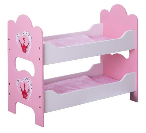 Розовые спинки выполнены в форме короны, постельное белье сшито из текстильной ткани с красивым узором в виде сердечек и цветов. Со стороны кровать смотрится как настоящая. Она изготовлена из натурального дерева, без зазубрин и шероховатостей.