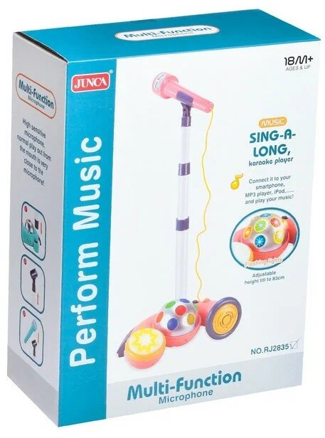 Домашние караоке – это отличный способ провести время для детей, а также отдохнуть от повседневных забот и насладиться пением любимых песен. Наша караоке-система обеспечивает вам приятное времяпрепровождения. Многофункциональная установка, состоящая из микрофона на стойке, барабанов с разными типами звучаний, 12 встроенных веселых мелодий и шара с переливающимися световыми огнями, впечатлит не только малыша, но порадует дошкольника. Микрофон на стойке — лучший подарок для вашего малыша, который обожает петь и выступать перед зрителями! Этот уникальный микрофон предоставляет возможность вашему ребенку испытать настоящее артистическое выступление прямо у себя дома. Кроме того, микрофон легко подключается к смартфону, MP3-плееру или iPod, что позволяет вашему малышу исполнять свои любимые песни, подпевая звучанию своего голоса через подключенные устройства. Функция регулирования громкости устройства гарантирует оптимальное звучание.