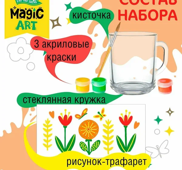 Роспись кружки — это отличный способ объединить семью за одним увлекательным занятием. С помощью различных трафаретов и красок, входящих в комплект, ваш ребенок сможет создать неповторимую композицию на стеклянной поверхности. Яркие цвета и оригинальные мотивы увлекут маленького художника, а совместная работа над проектом укрепит семейные связи и научит вниманию к деталям.
