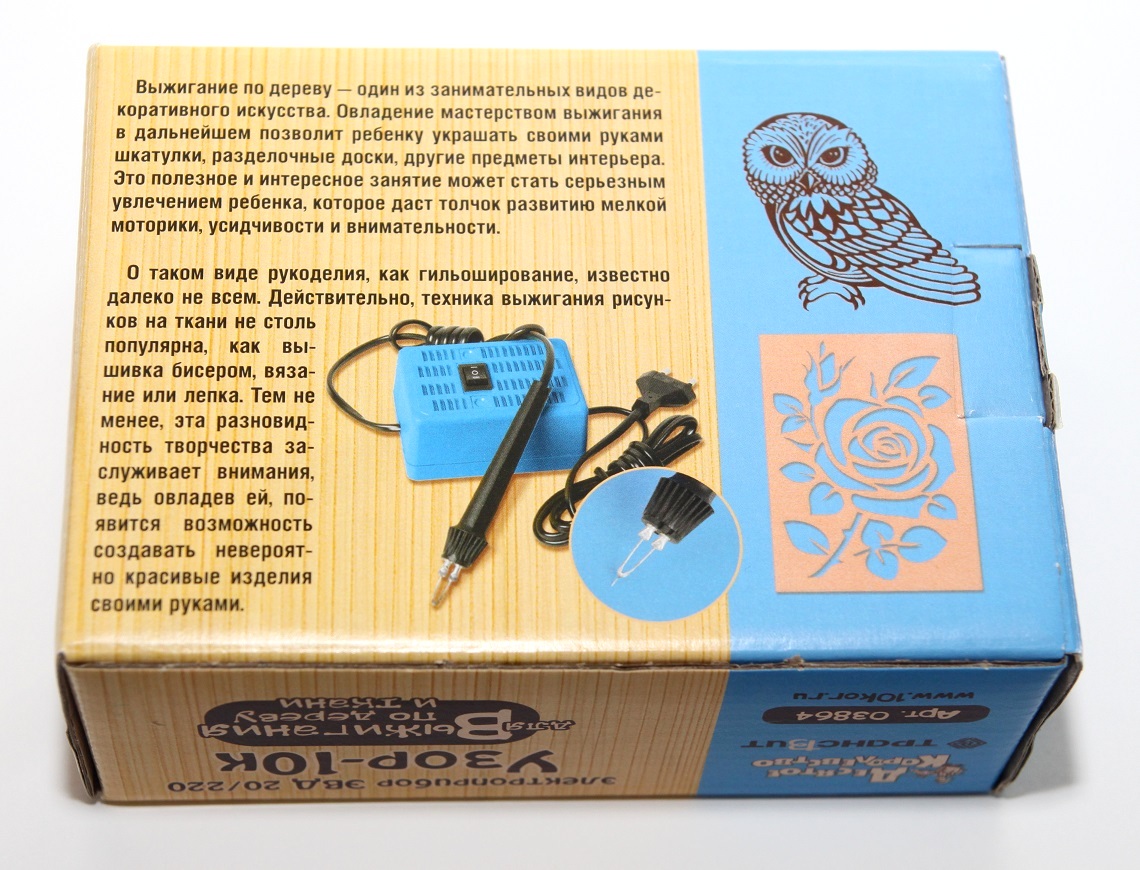- С помощью данного предмета у вашего ребенка получится выполнять как простые, так и сложные узоры по дереву, а также по ткани.