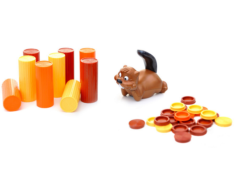 Игровое поле - пруд с 2 берегами (размер 25 х 14 х 13 см), 42 бревна (длина 4.5 см), фигурка бобра, деревянная палочка (длина 14 см), инструкция. |