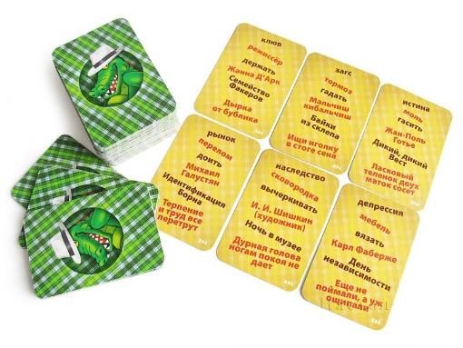 В коробке вы найдете 350 карточек, более 2000 заданий, песочные часы, 2 кубика, блокнот для записей. Играть можно как поодиночке, так и командами.