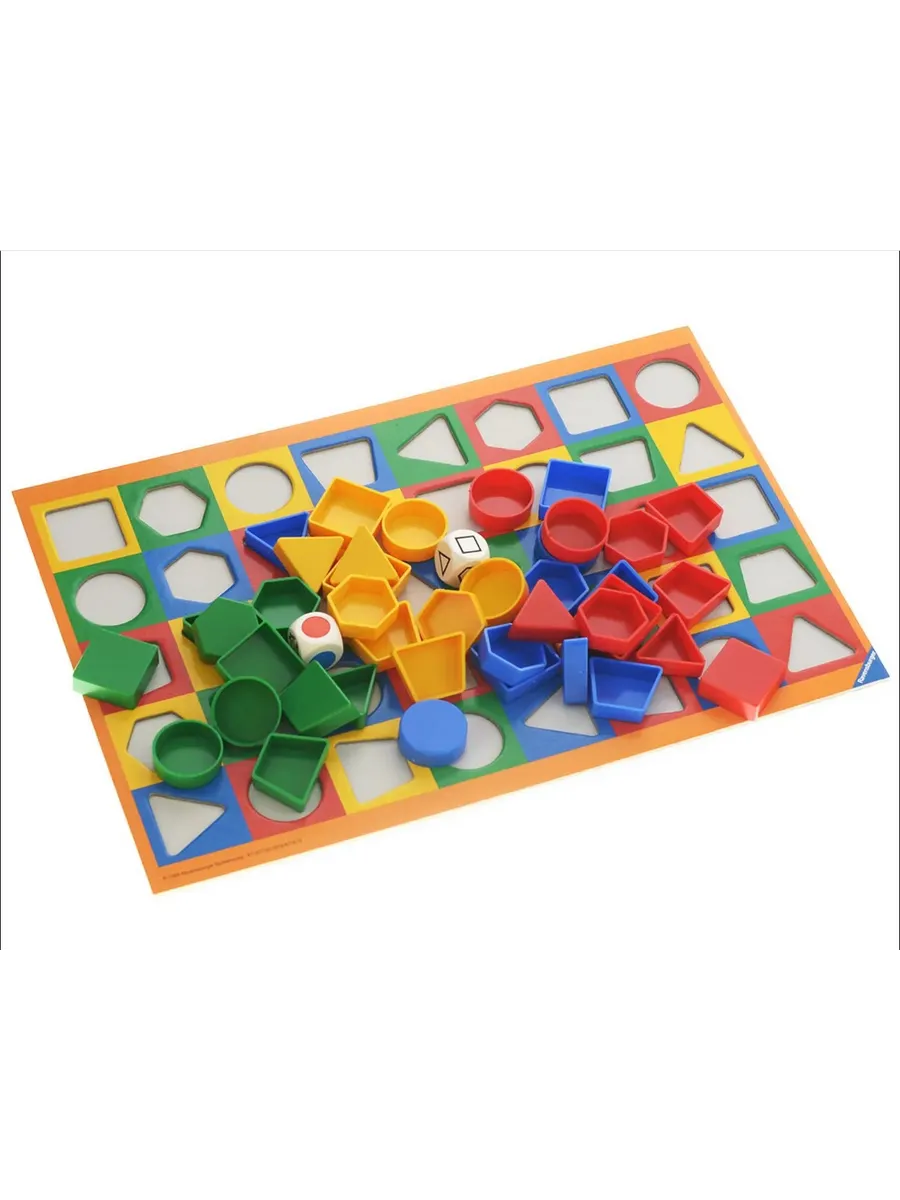 - В комплекте идут пластиковые фигурки: треугольники, квадраты, круги, шестиугольники, трапеции