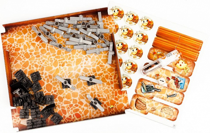таракан HEXBUG nano, 18 призовых фишек, трехмерное игровое поле, 24 элемента лабиринта, 24 колышка для соединения лабиринта, 4 элемента-двери, 4 ловушки, игральный кубик, инструкция. |