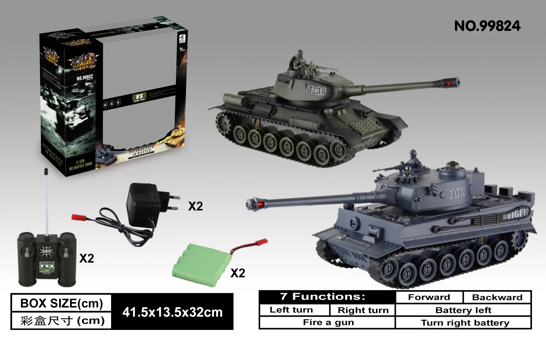 2 танка русский T-34 и немецкий Tiger, 2 аккумулятора 4.8v 700mAh, 2 зарядных устройства, 2 пульта, инструкция |
