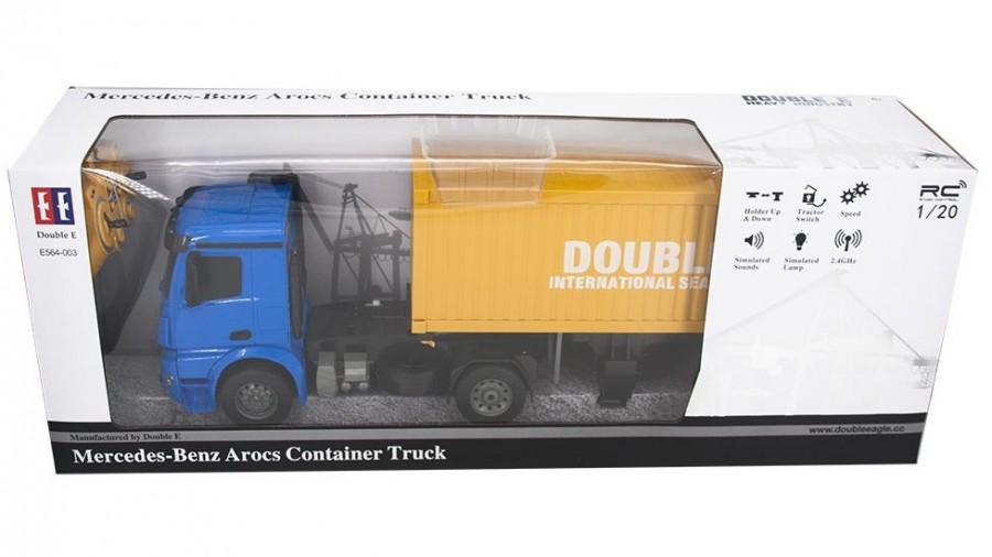 Радиоуправляемый контейнеровоз Double E Mercedes-Benz Arocs 1:20 2.4G - E564-003 - это радиоуправляемый грузовик Mercedes-Benz с прицепом. Прицеп можно пристегивать и отстегивать, в нем можно открывать задние двери и перевозить грузы. Звуковое сопровождение запуска автомобиля, движения, заднего хода и остановки тягача.