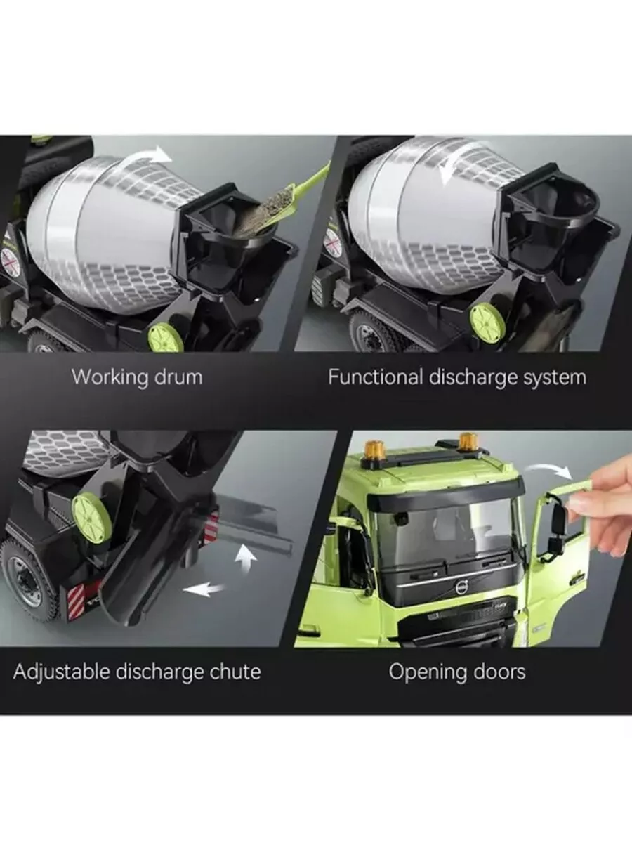 - Светодиодная подсветка и звуковые эффекты: Для максимального погружения в игровой процесс модель оснащена светодиодной подсветкой и воспроизводит реалистичные рабочие звуки бетоновоза.