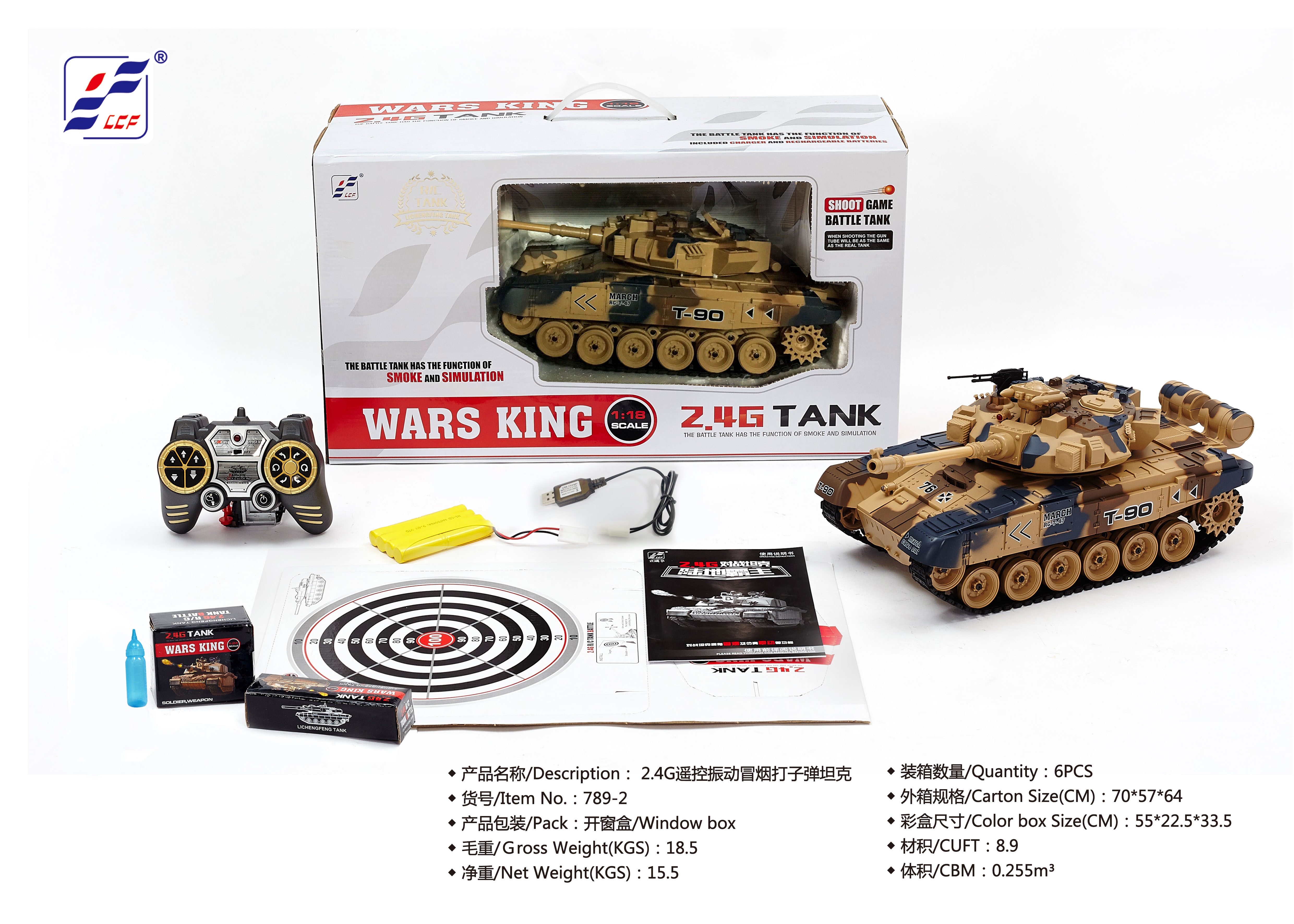 Танк на радиоуправлении выполнен в масштабе 1:18 (47 см.), и имеет множество замечательных плюшек для любителей радиоуправляемых моделей. Начнем с того что кроме уже привычных звуковой — световой имитации стрельбы и работы двигателя, в наличии дымогенератор демонстрирующий газовый выхлоп. В комплекте фигурка танкиста, 2 типов пулеметов, мишень, пластиковые пульки-снаряды, и масло для дыма.