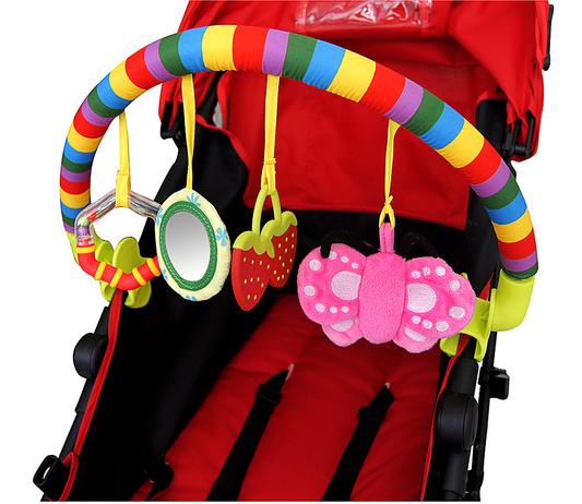 Эту дугу можно закрепить на детской кроватке, коляске или автокресле с помощью удобных прищепок. Угол наклона дуги регулируется. Дугу можно использовать с 1 месяца жизни малыша. Сначала малыш будет просто рассматривать яркие игрушки, лежа на спинке, но со временем он обязательно начнет тянуться к ним ручками и ножками, совершенствуя свои двигательные навыки. Игрушки на дуге сделаны из разных материалов - специально для развития тактильных ощущений малышей. В набор входят: мягкая игрушка "бабочка", безопасное зеркальце, погремушка-колечко с прорезывателем, прорезыватель "клубничка". Изделие изготовлено из текстильных материалов с элементами пластмассы.