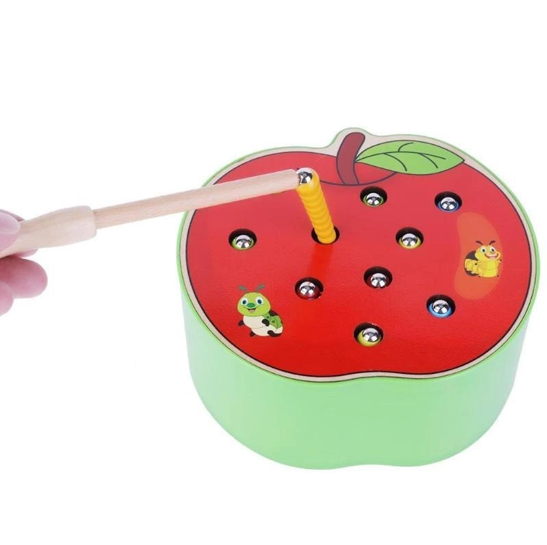 Что позволяет сортировать их по цветам, изучая. В каждой деревянной игрушке червячки есть магнитная палочка, с помощью которой и ловятся червячки. Сначала ребенок научится доставать их из отверстий, позже, когда этот навык он хорошо закрепит, будет сажать аккуратно их обратно. Это не так просто, как кажется, и требует большой сосредоточенности и меткости. Магнитные рыбалки отлично развиваю мелкую моторику, усидчивость и терпение. Тренируем моторику, пальчиковый захват, умение держать карандаш, глазомер, межполушарные связи. Учим цвета и счет. Магнитная игра “Поймай червячка” одна из лучших магнитных рыбалок для детей.