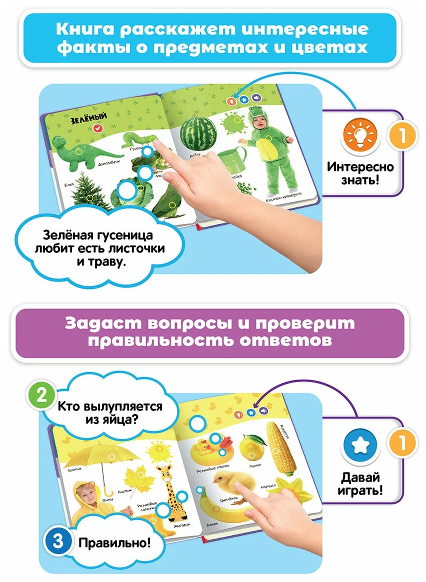 Интерактивные двусторонние страницы изготовлены из красочного картона и украшены яркими настоящими картинками, которые привлекут внимание детей и вызовут интерес к учебному процессу. На каждом развороте есть 3 режима: в первом режиме можно просто слушать названия цветов и различных предметов; во втором режиме можно узнать интересный факт о каждом изображении; в третьем режиме предлагается найти и показать определенный цвет или предмет. Каждый разворот также имеет регулировку громкости, что позволяет настроить звук под комфортные условия.