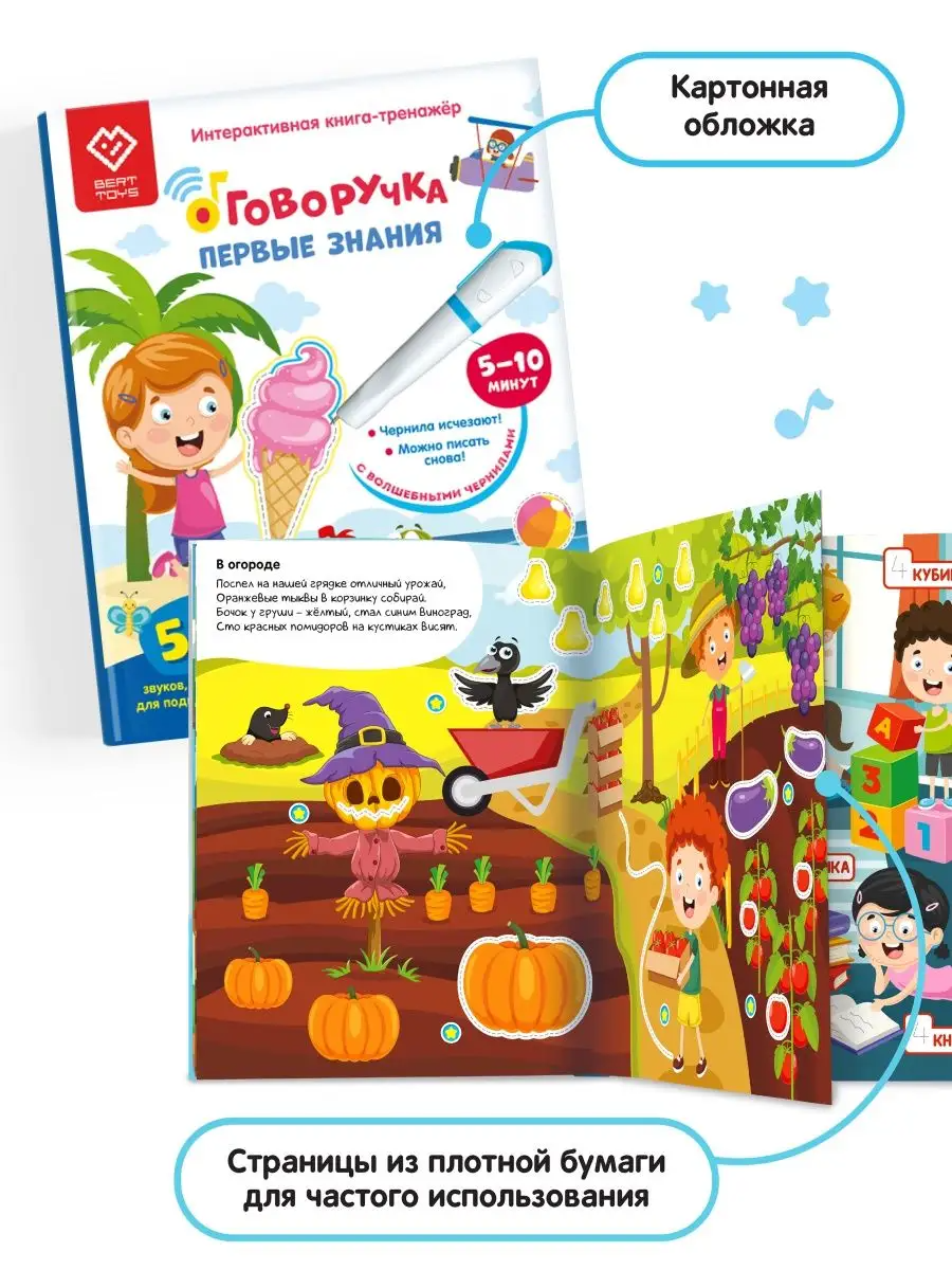 Интерактивная книга-тренажер «Первые знания» для детей от 2 до 6 лет - это инновационное обучающее средство, которое поможет вашему ребенку развить различные навыки и умения. Взаимодействуя с ручкой-тренажером Говоручка от BertToys, эта большая музыкальная книга предлагает увлекательные задания и игры, которые помогут вашему ребенку расширить свои знания и навыки.