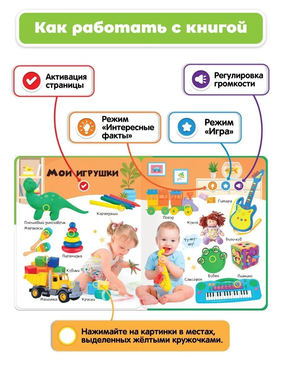 Одно касание пальчика - и картинки на страницах оживают! Книжка имеет двусторонние интерактивные страницы, и на каждой из них представлены яркие и красочные фотографии, которые привлекут внимание ребенка и вызовут его интерес к учебе. Кроме того, реалистичные звуки, воспроизводимые книжкой, помогут малышу запомнить информацию и познакомиться с новыми знаниями.