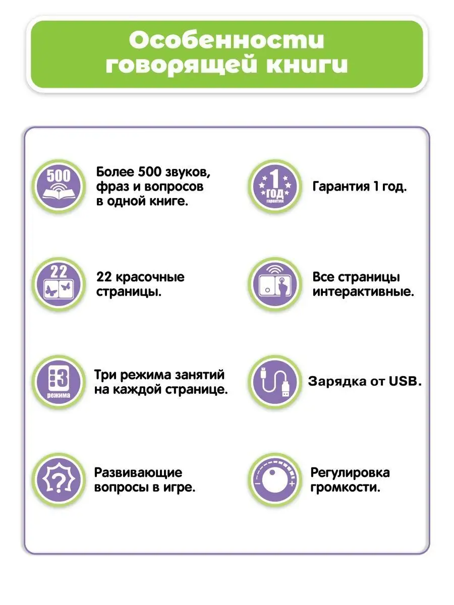 говорящая книга (11 функциональных страниц), зарядное устройство, инструкция на русском языке |