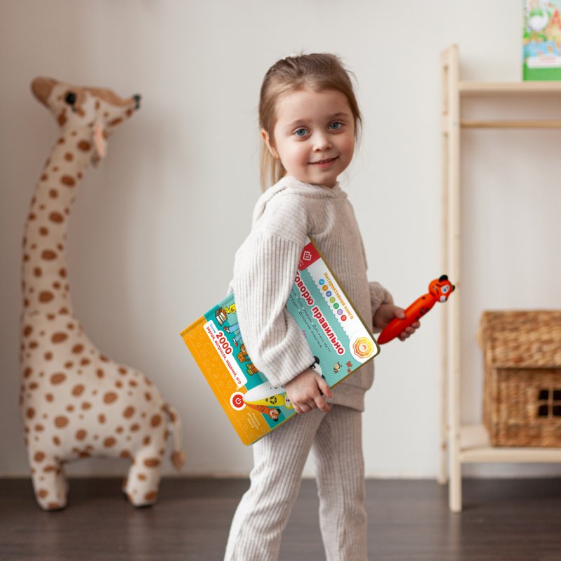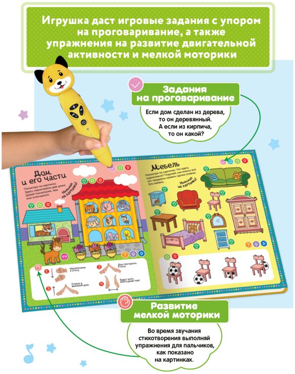 Логопедическая книга для развития речи, в которой более 2000 звуков, вопросов, заданий и игр. Взаимодействует с логопедическими игрушками: Панда Тичи, Тигрёнок Рыки и Собачка Буля.Интерактивное чтение