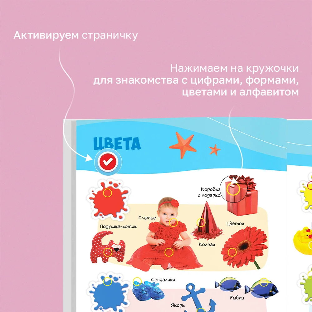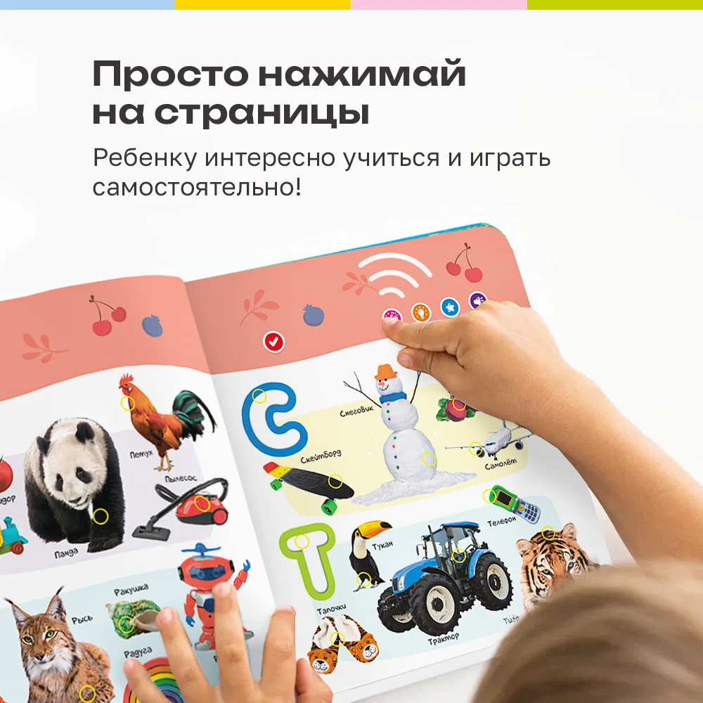 Эта уникальная книга оживает при прикосновении: достаточно нажать пальчиком на страницы или картинки, и они заговорят, запоют или воспроизведут реалистичные звуки. Издание включает 28 страниц с яркими фотографиями, а также более 800 звуков — сказки, песни, потешки, стихи, чистоговорки, мелодии, звуки природы, познавательные факты, речевые и двигательные упражнения. Книга не только воспроизводит контент, но и задает вопросы, проверяя правильность ответов, что делает обучение еще более увлекательным.