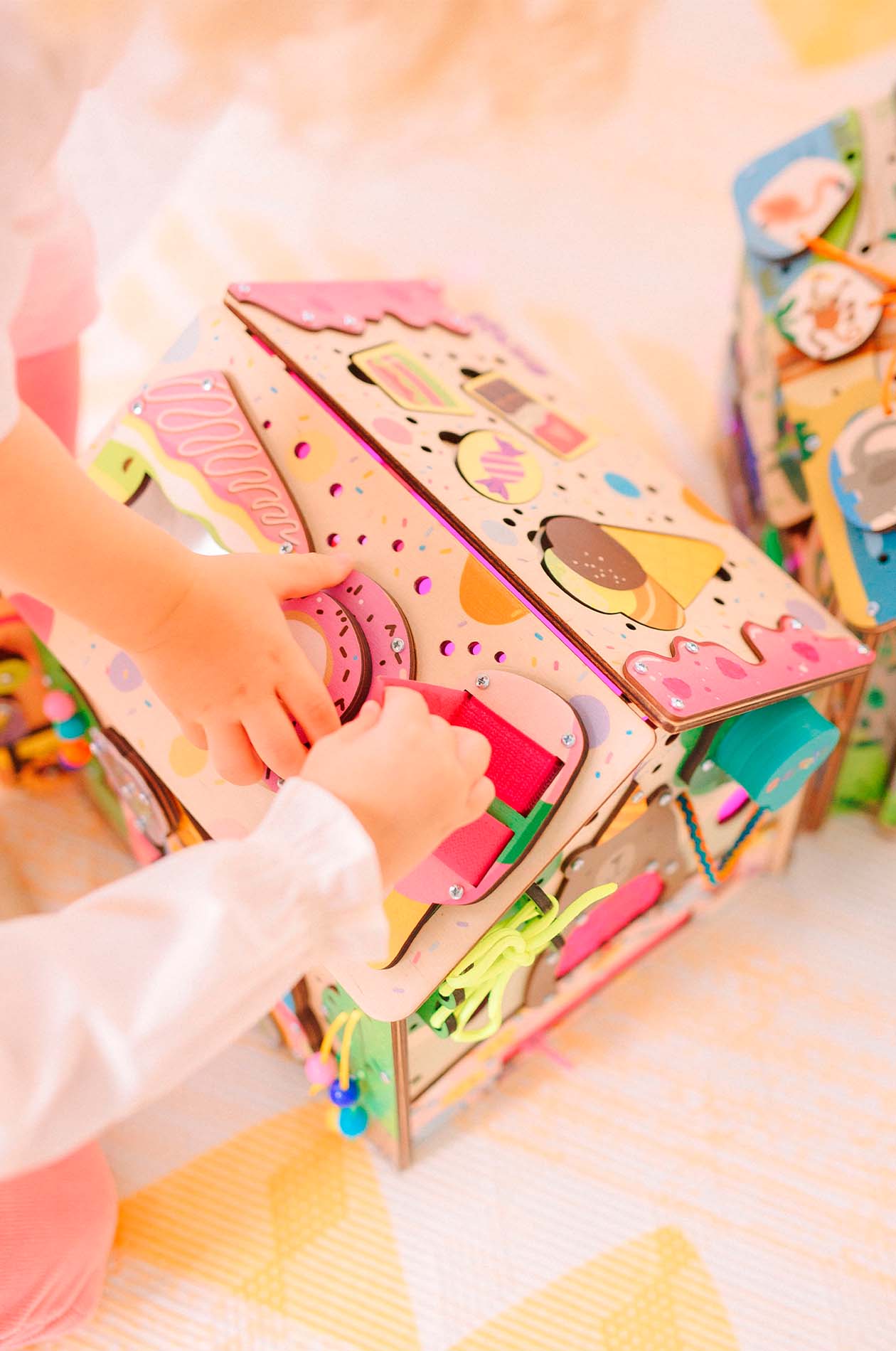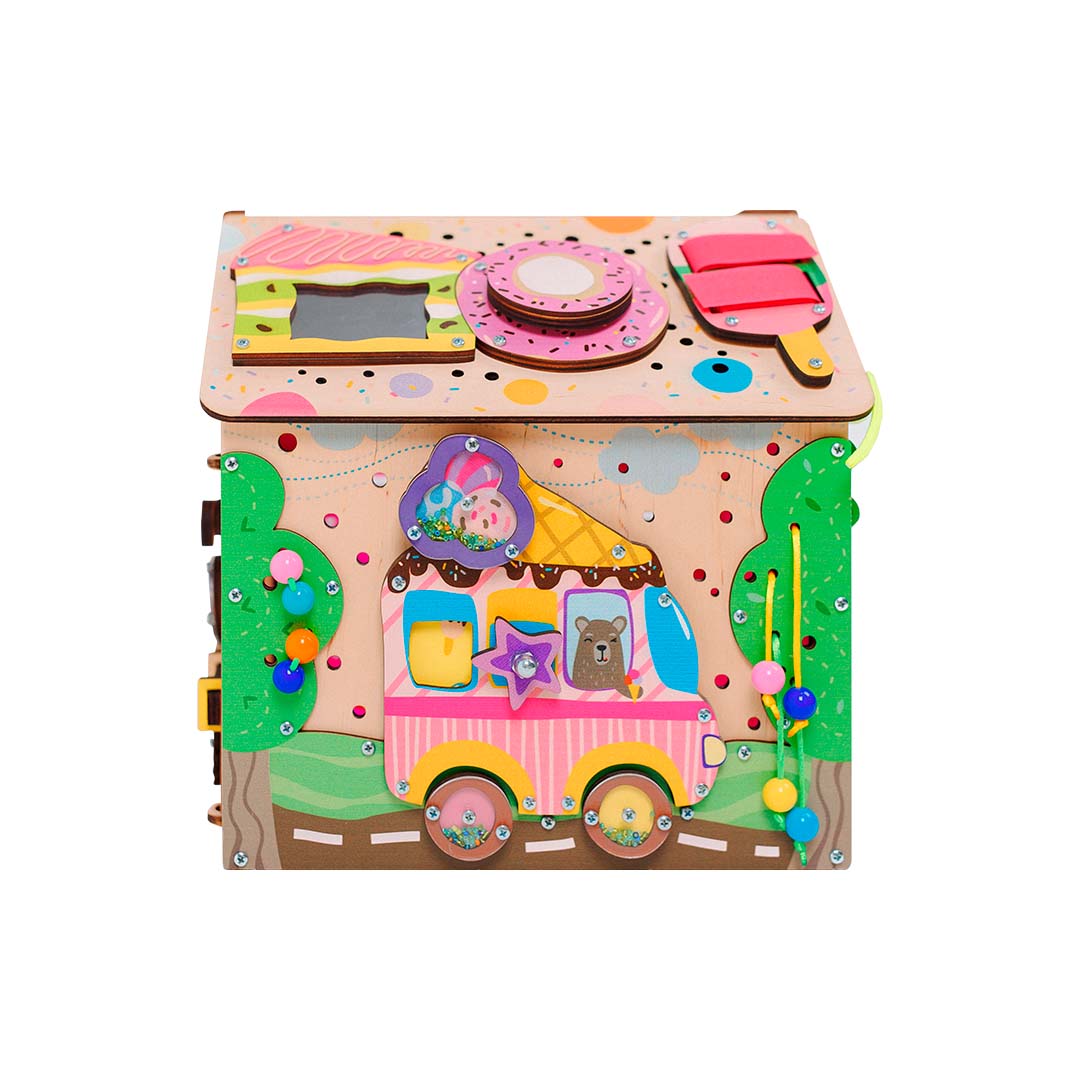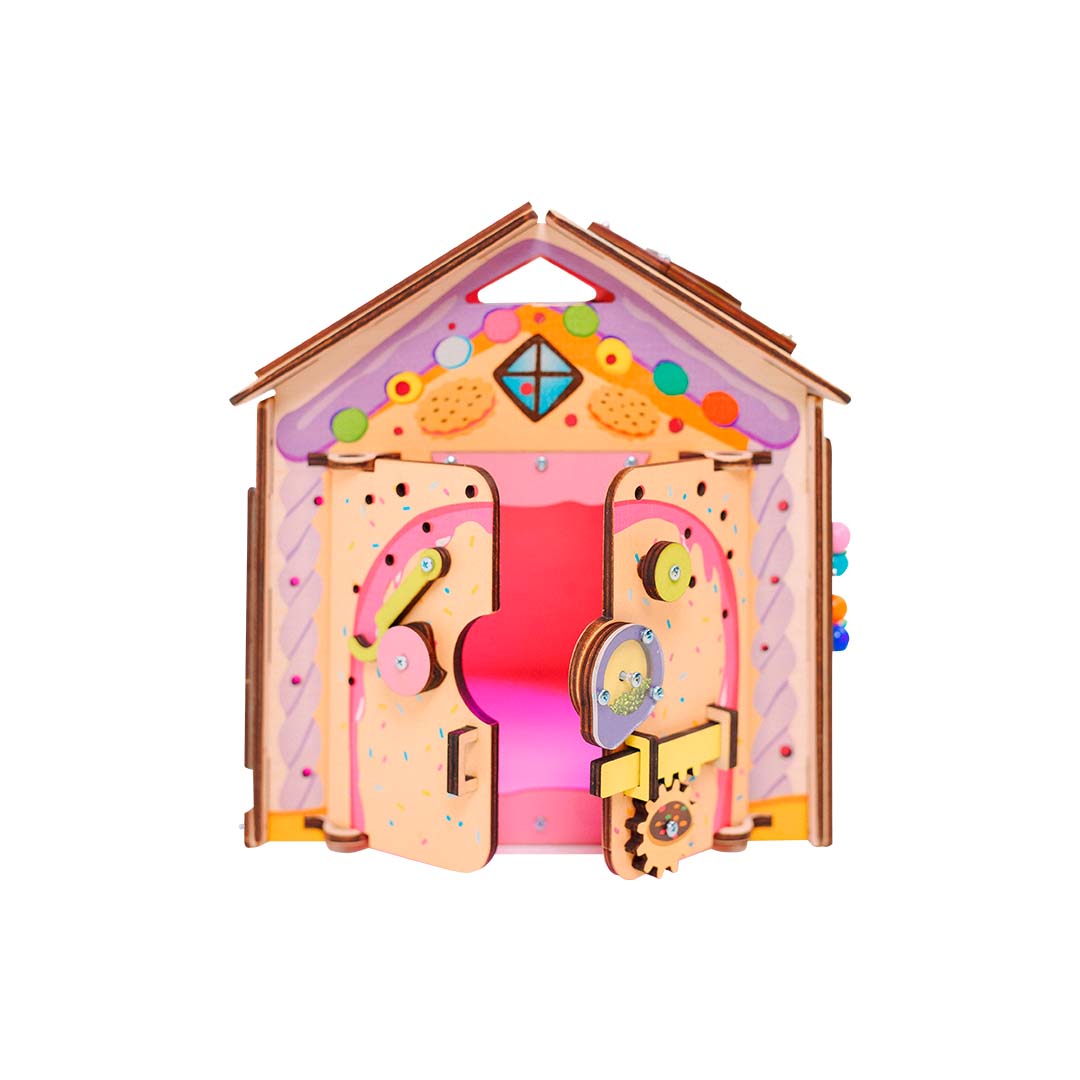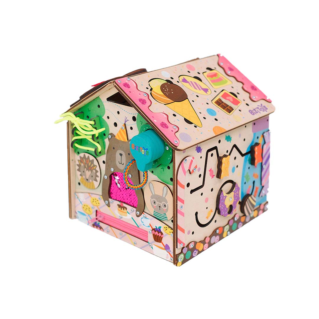 Милый бизидомик для маленьких девочек сладкоежек. Сделан согласно методике Монтессори. На домике закреплено 15 разных элементов для развития мелкой моторики, координации движений, логики и воображения.