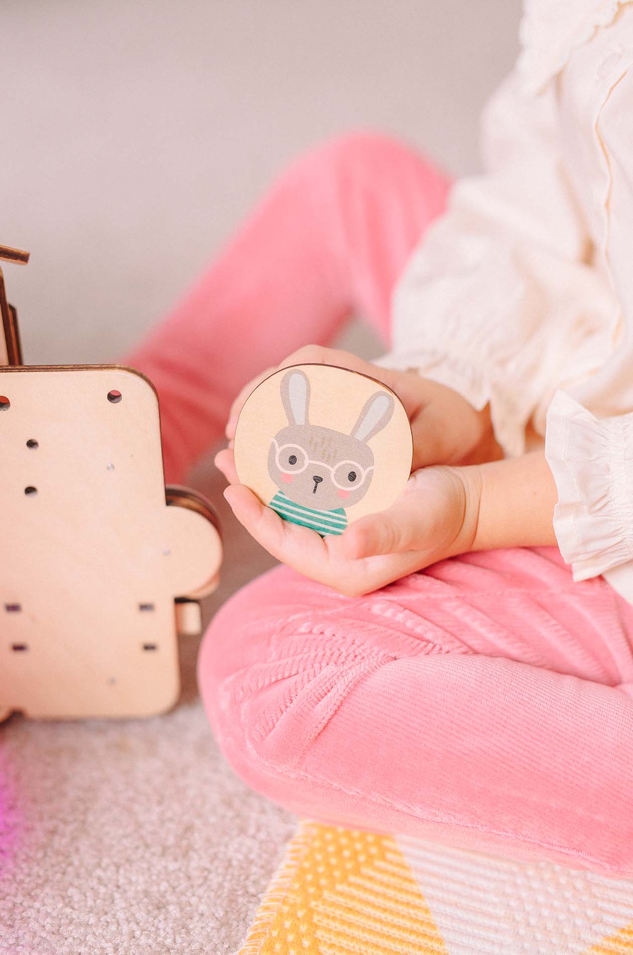 На стену крепятся съемные элементы, которые идут в комплекте с домиком. На них нарисованы: заяц, ежик, енот, лисичка.