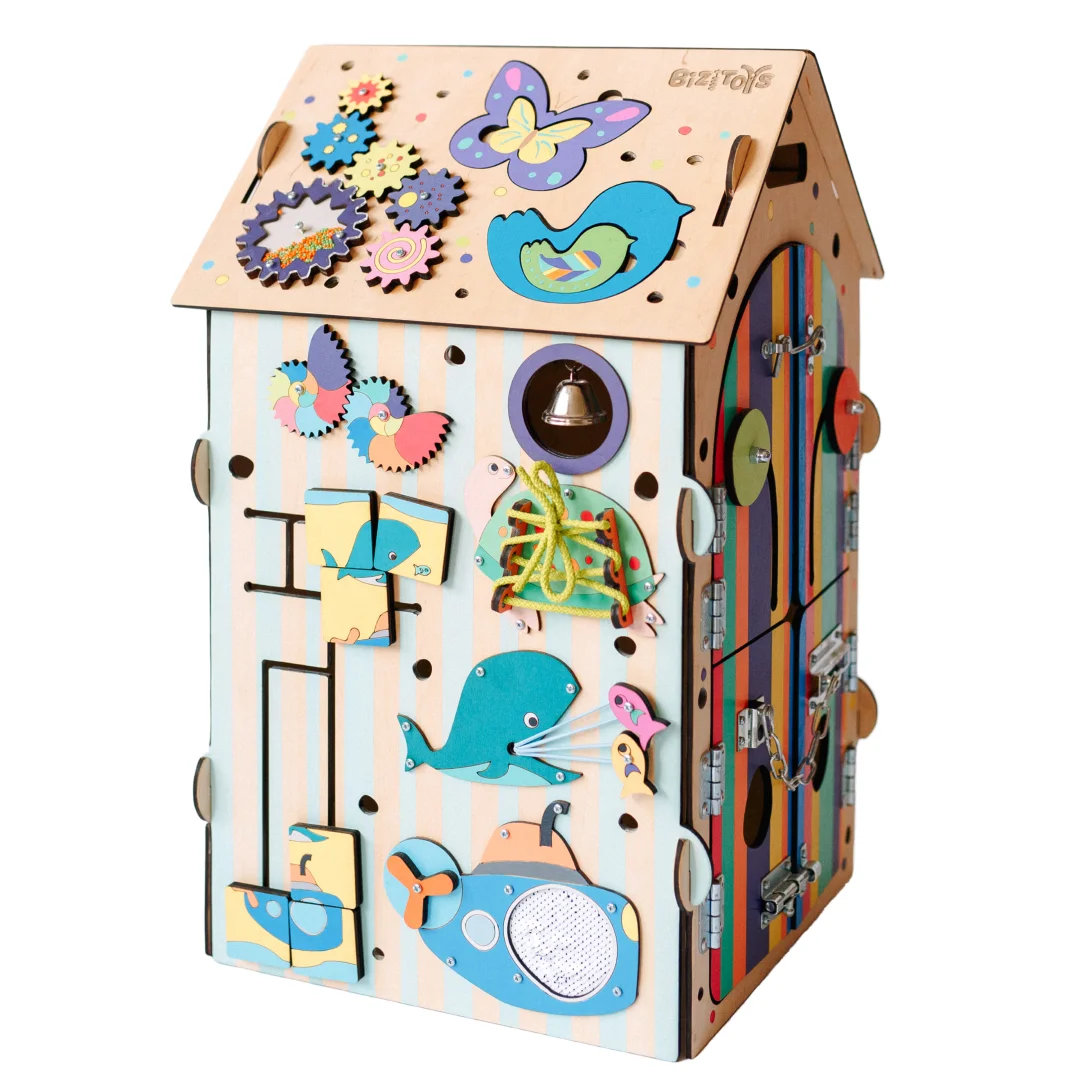 Крыша: Если покрутить за одну шестерню, то все остальные весело закрутятся в след за ней! Бабочка и птичка научат малыша таким понятиям как "большое" и "маленькое"!