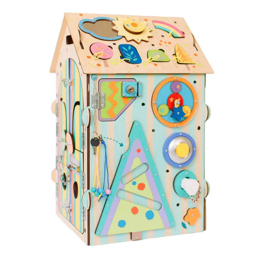 Сторона Г: Дверка с такими любимыми ключиками - научись открывать ее и узнай кто прячется за дверкой! По веселому сказочному дереву скатываются монетки - запускай сверху и лови их снизу! Светильник, который зажигается при нажатии на него! импровизированная розетка, шестерня с ручкой - покрути ее и понаблюдай, как внутри прокручиваются небольшие шестеренки! Бусинки на веревках можно перебирать пальчиками и учить цвета!