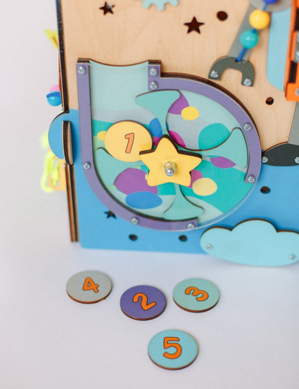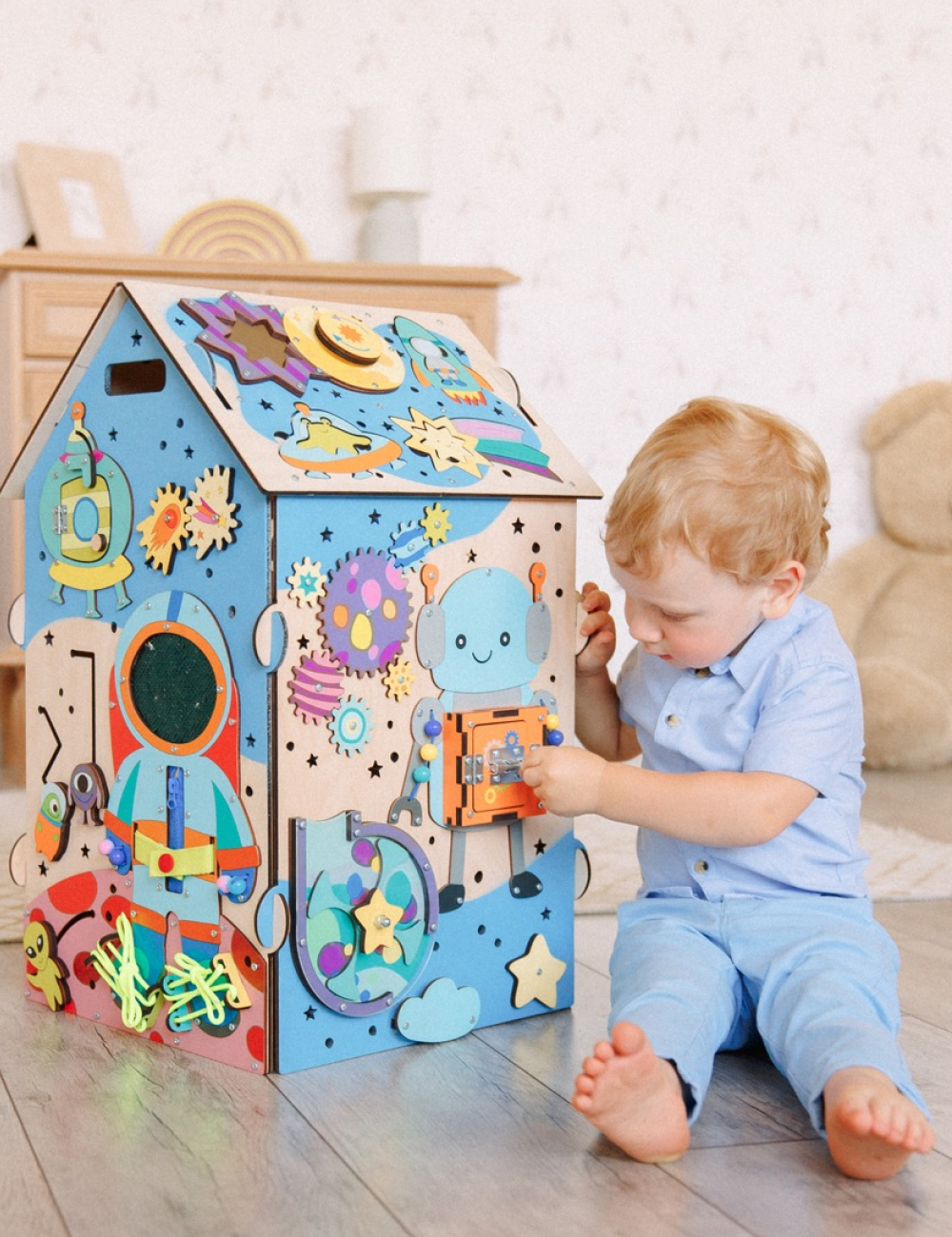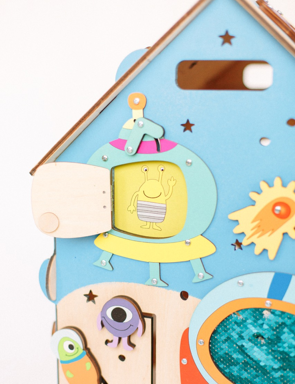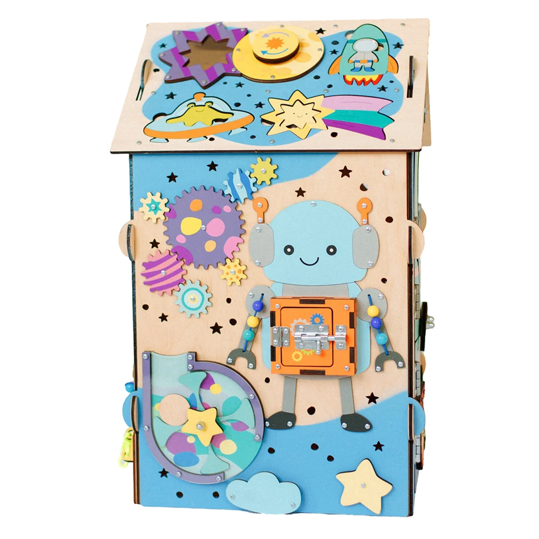 Открывая дверки домика, ваш малыш может залезть во внутрь, посидеть и спрятаться в нем. Верхние дверки закрываются на маленькие деревянные элементы сверху. На дверках размещены подвижные элементы: звездочка и комета. Их можно тянуть вверх и вниз, развивая тем самым мелкую моторику пальчиков