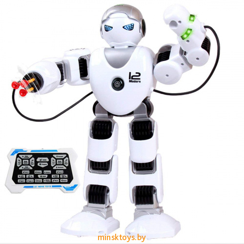 Он может: ходить, стрелять, драться, проигрывать музыку и танцевать. Маленький да удаленький. Кстати, о габаритах, они составляют 390 x 260 x 120 мм, а вес 1005 грамм.